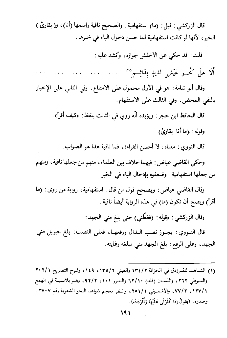 قال الزركشي: قيل:" ما " استفهامية، والصحيح أنها نافية واسمها (أنا)، و (بقارئ) الخبر، إذ لو كانت استفهامية لما حسن دخول الباء في خبرها.