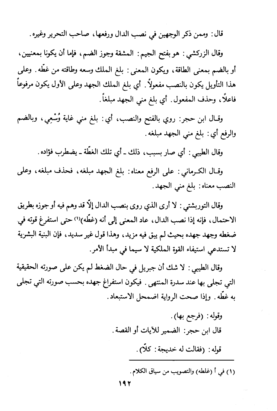 وقال الطيبي: لا شك أن جبريل في حال الضغط لم يكن على صورته الحقيقية التي تجلى بها عند سدرة المنتهى، فيكون استفراغ جهده بحسب صورته التي تجلّى به غطّه. وإذا صحّت الرواية اضمحل الاستبعاد.