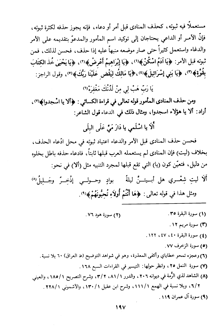 مستعملاً فيه ثبوته، كحذف المنادى قبل أمر أو دعاء، فانه يجوز حذفه لكثرة ثبوته، فإن الآمر أو الداعي يحتاجان إلى توكيد اسم المأمور والمدعو بتقديمه على الأمر والدعاء. واستعمل كثيرًا حتى صار موضعه منبهًا عليه إذا حذف، فحسن حذفه لذلك. فمن ثبوته قبل الأمر: (يا آدم اسكن) [البقرة: 35]، (يا إبراهيم أعرض) [هود: 76]، (يا يحيى خذ الكتاب بقوة) [مريم: 12]، (يا بني إسرائيل)، (يا مالك ليقض علينا ربك) [الزخرف: 77]، وقول الراجز: