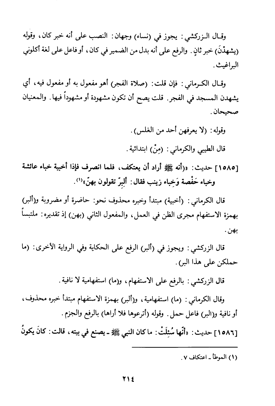 1585 - حديث: "أنه صلى الله عليه وسلم أراد أن يعتكف، فلما انصرف فإذا أخبية خباء عائشة وخباء حفصة وخباء زينب، فقال: ألبرّ تقولون بهنّ".