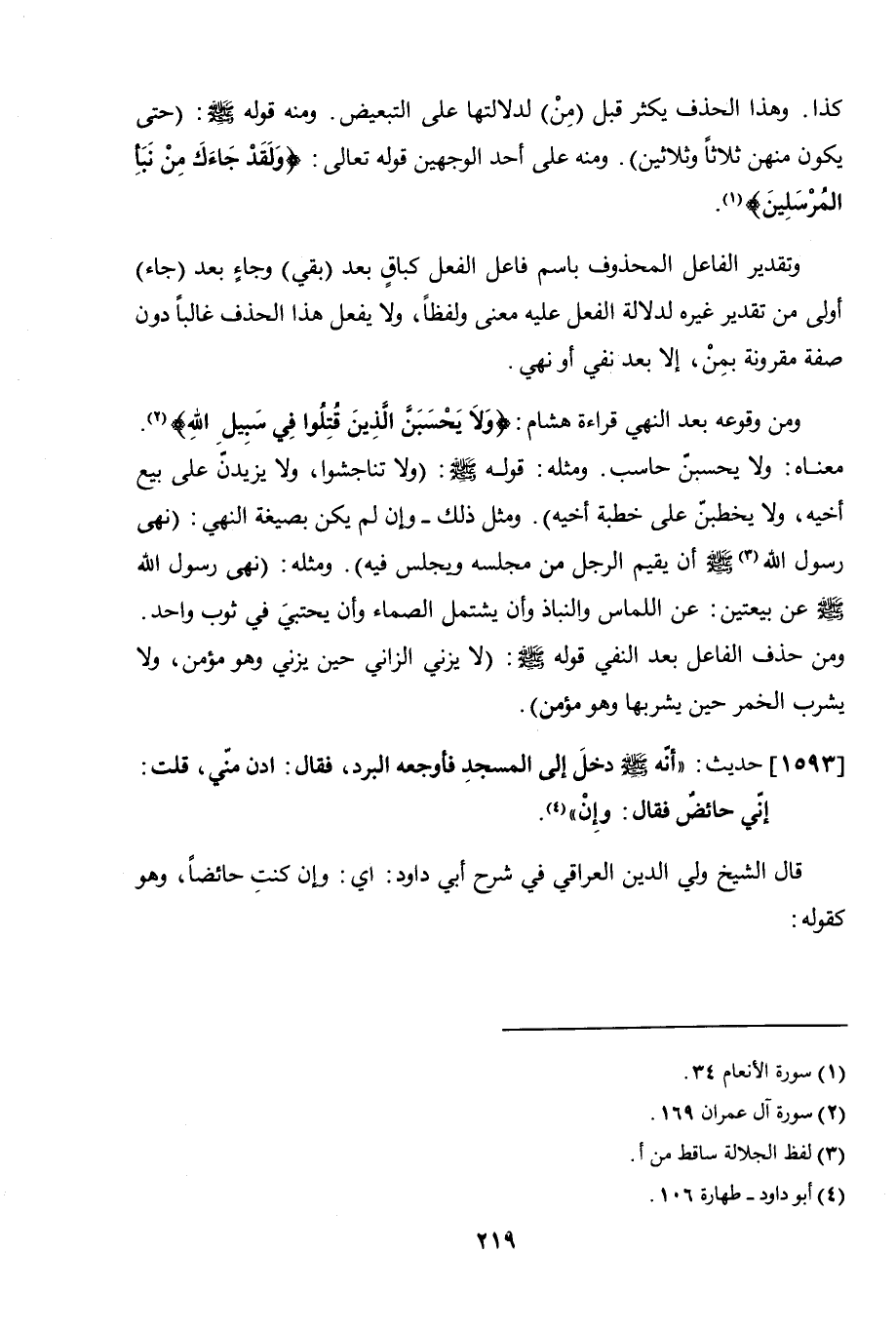 معناه: ولا يحسبنّ حاسب. ومثله قوله - صلى الله عليه وسلم: (ولا تناجشوا، ولا يزيدن على بيع أخيه، ولا يخطبن على خطبة أخيه). ومثل ذلك، وإن لم يكن بصيغة النهي: (نهى رسول الله - صلى الله عليه وسلم - أن يقيم الرجل من مجلسه ويجلس فيه). ومثله: (نهى رسول - صلى الله عليه وسلم - عن بيعتين: عن اللماس والنباذ، وأن يشتمل الصماء، وأن يحتبي في ثوب واحد). ومن حذف الفاعل بعد النفي قوله - صلى الله عليه وسلم -: (لا يزني الزاني حين يزني وهو