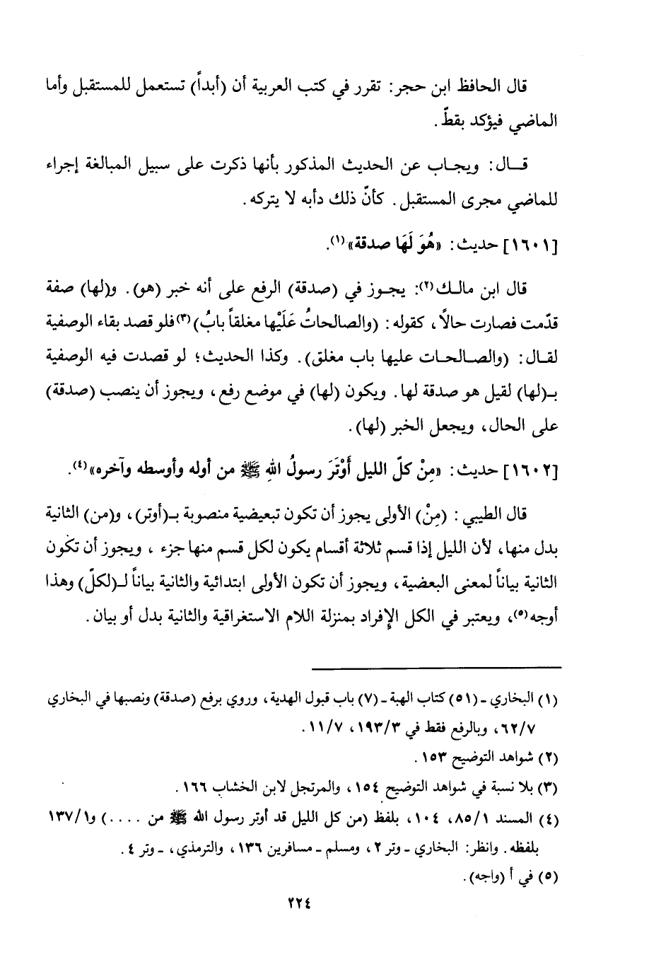 قال ابن مالك: يجوز في " صدقة" الرفع على أنه خبر "هو"، و"لها" صفة قدمت فصارت حالاً، كقوله: (والصالحات عليها مغلقًا بابُ) فلو قصد بقاء الوصفية لقال: "والصالحات عليها باب مغلق".