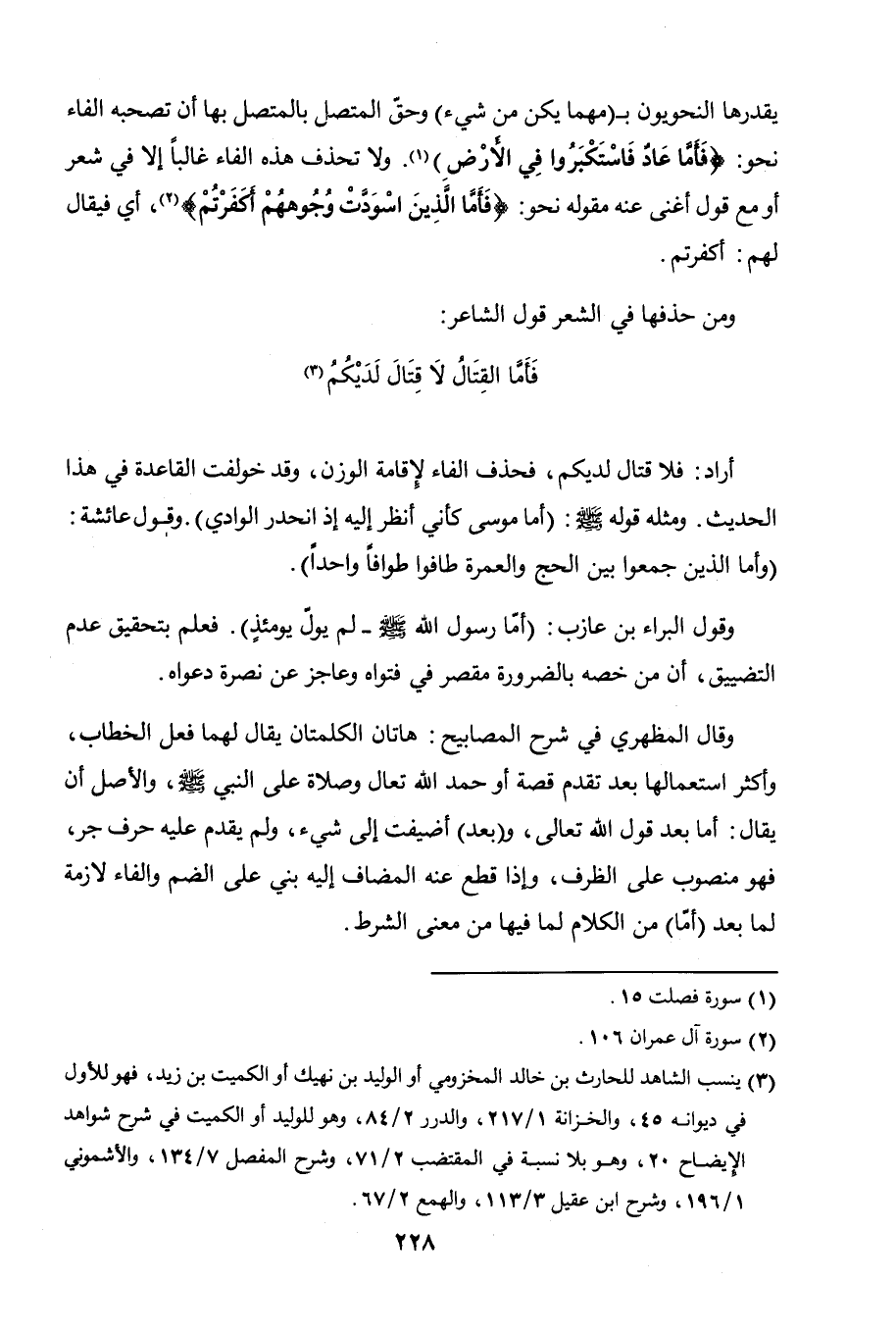 يقدرها النحويون بـ "مهما يكن من شيء" وحق المتصل بالمتصل بها أن تصحبه الفاء، نحو: (فأما عاد فاستكبروا في الأرض) [فصلت: 15]. ولا تحذف هذه الفاء غالبًا إلا في شعر، أومع قول أغنى عنه مقوله، نحو: (فأما الذين اسودت وجوههم أكفرتم) [آل عمران: 106]. أي: فيقال لهم: أكفرتم.