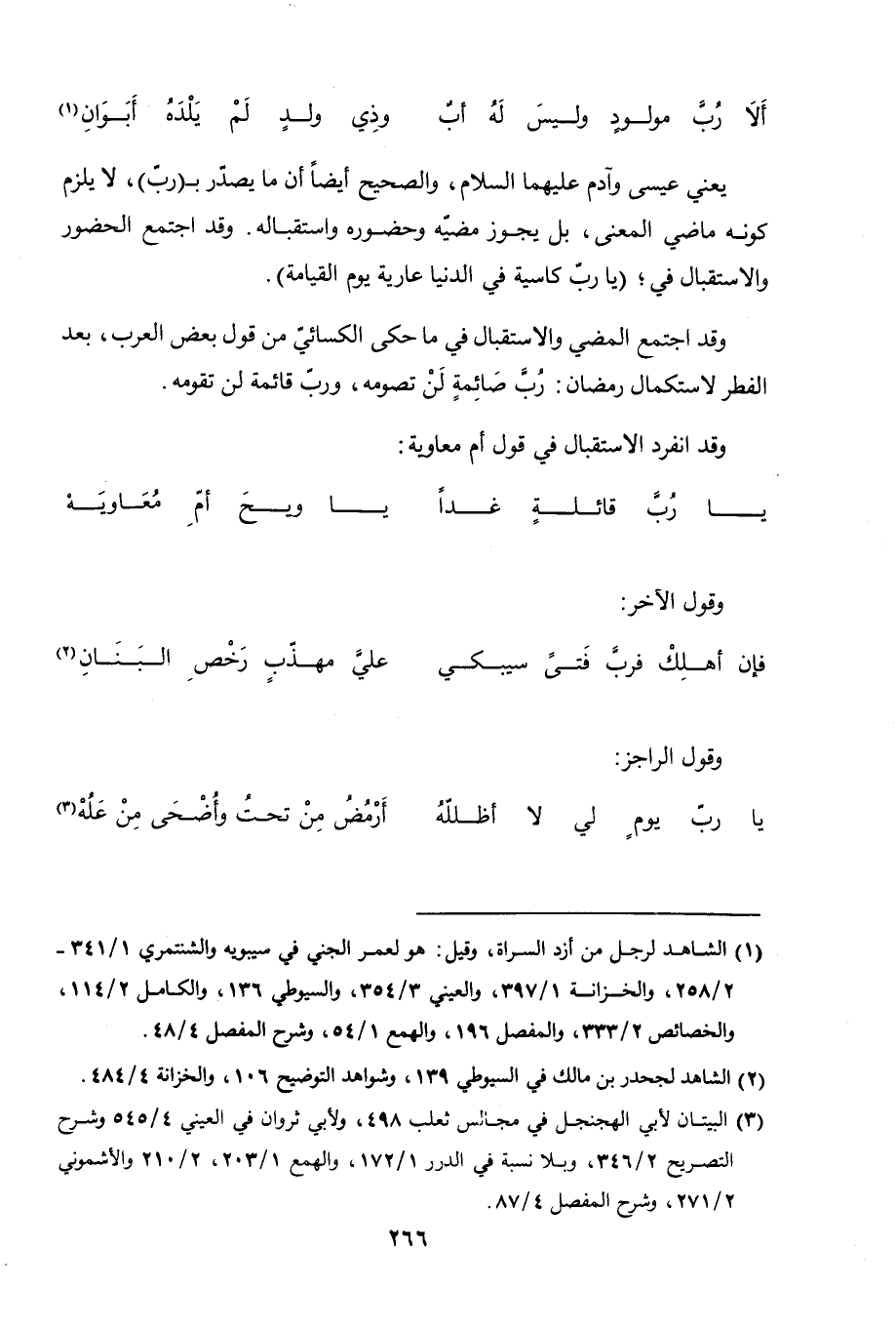 يعني عيسى وآدم عليهما السلام. والصحيح أيضًا أن ما يصدر بـ "رب" لا يلزم كونه ماضي المعنى، بل يجوز مضيه وحضوره واستقباله. وقد اجتمع الحضور والاستقبال في: "يا رب كاسية في الدنيا عارية يوم القيامة).