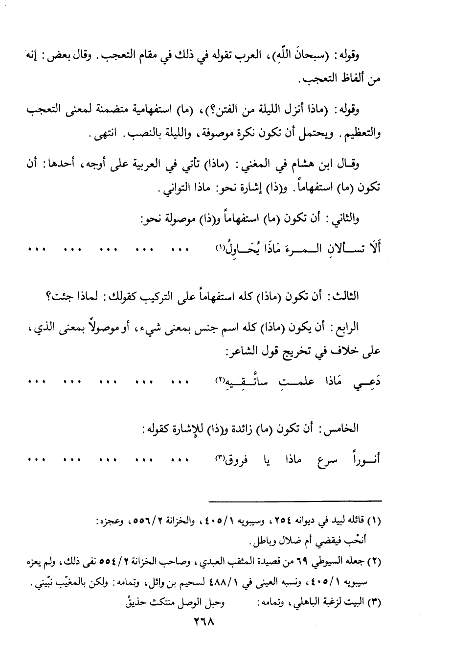 وقال ابن هشام في المغني: (ماذا) تأتي في العربية على أوجه، أحدها: أن تكون (ما) استفهامًا. و (ذا) إشارة نحو: ماذا التواني.
