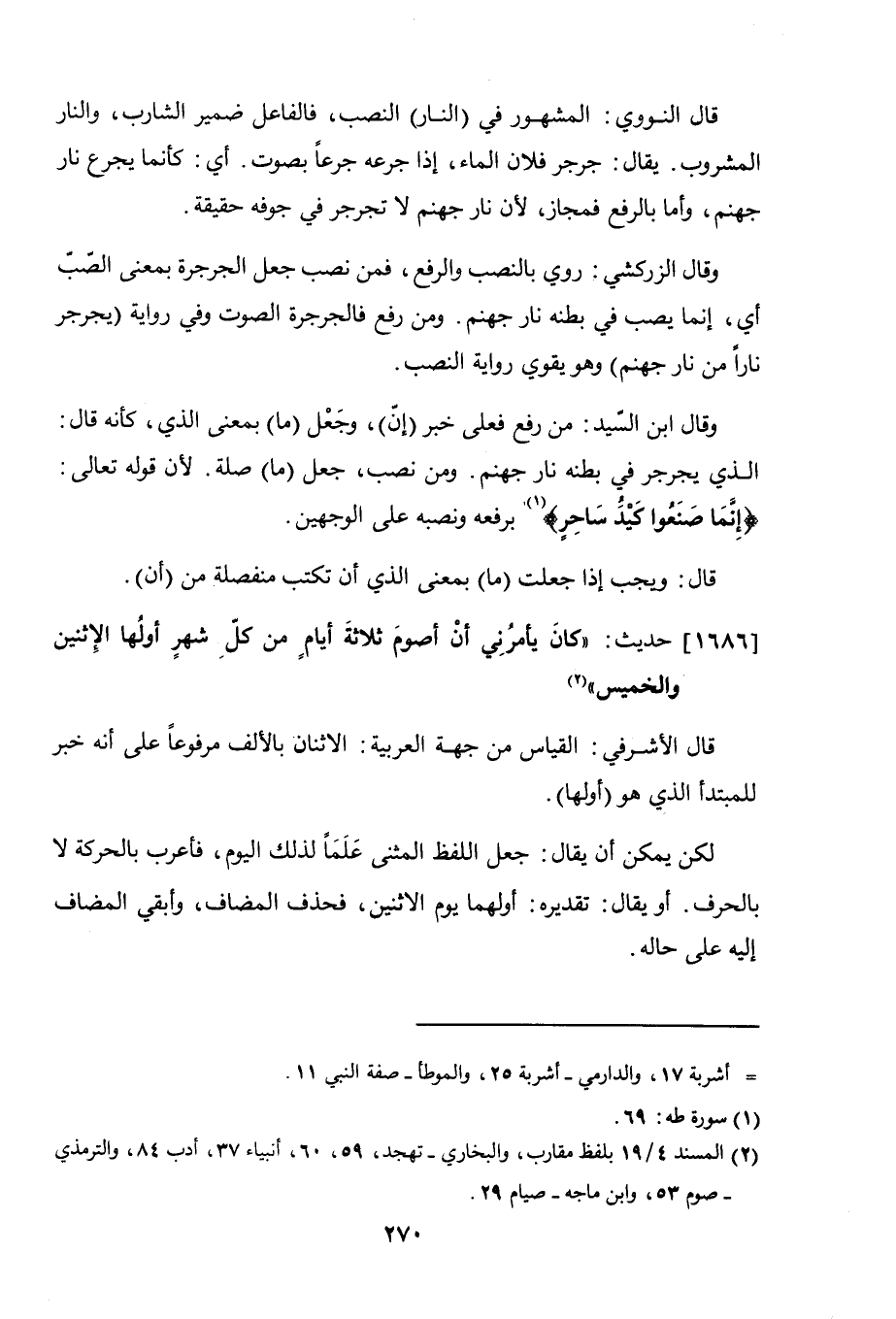 وقال ابن السيد: من رفع فعلى خبر (إنّ)، وجعل (ما) بمعنى الذي، كأنه قال: الذي يجرجر في بطنه نار جهنم. ومن نصب، جعل (ما) صلة. لأن قوله تعالى: (إنما صنعوا كيد ساحر) برفعه ونصبه على الوجهين.