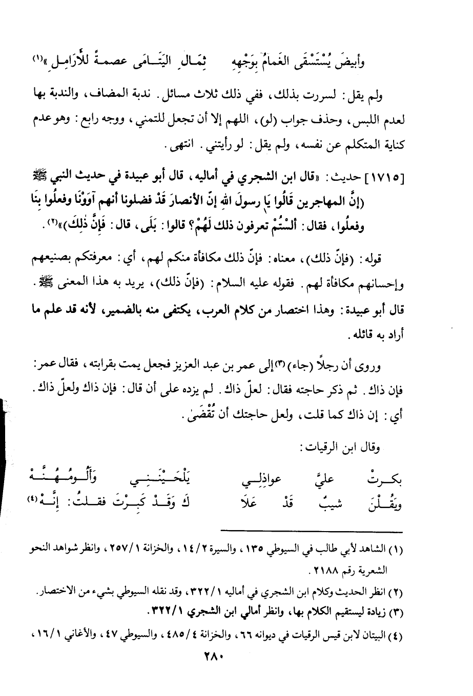 1715 - حديث: "قال ابن الشجري في أماليه: قال أبو عبيدة في حديث النبي صلى الله عليه وسلم: " إن المهاجرين قالوا: يا رسول الله، إن الأنصار قد فضلونا، إنهم آوونا وفعلوا بنا وفعلوا، فقال: ألستم تعرفون ذلك لهم؟ قالوا: بلى، قال: فإن ذلك".