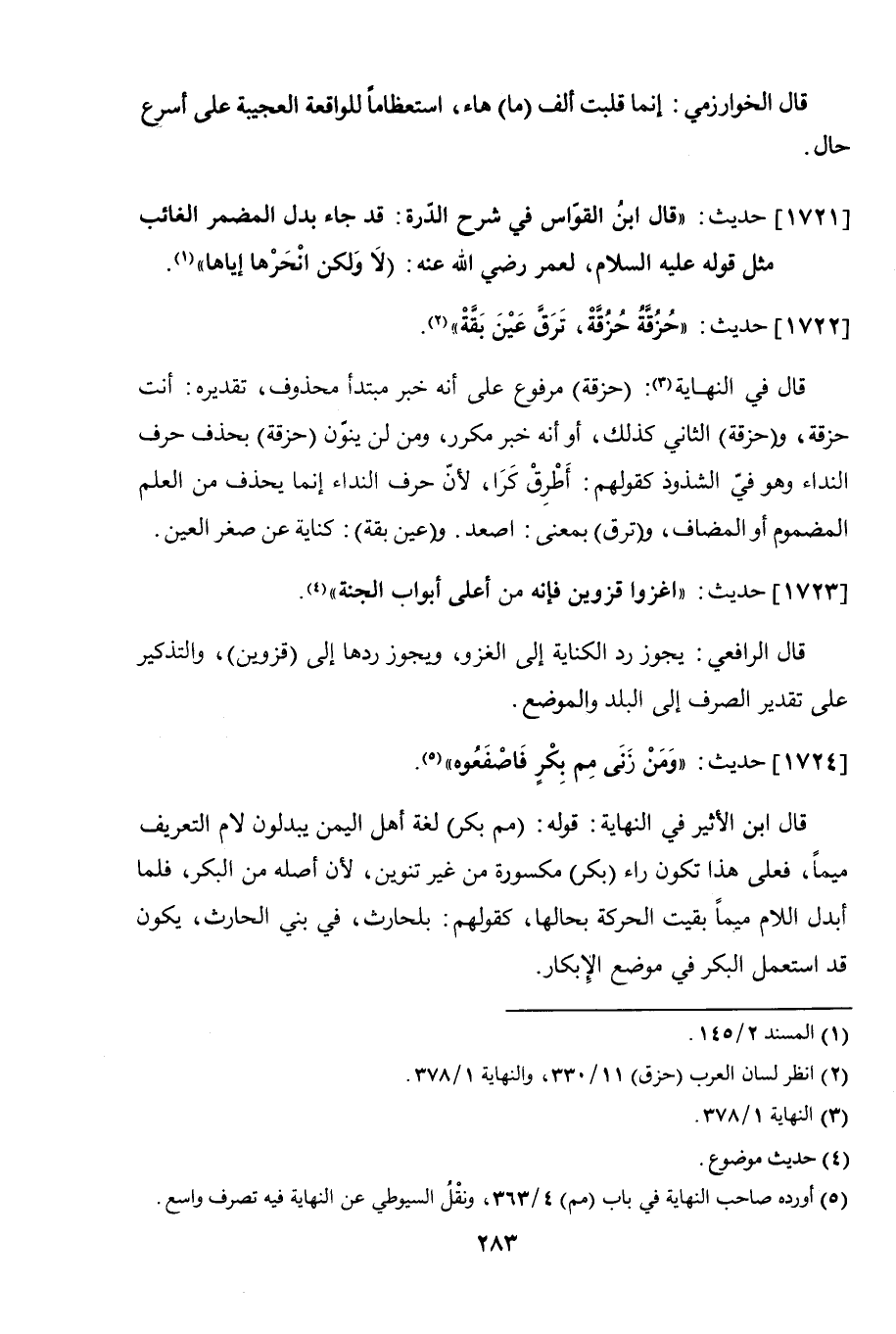 1721 - حديث: "قال ابن القواس في شرح الدرة: قد جاء بدل المضمر الغائب مثل قوله عليه السلام، لعمر رضي الله عنه: (لا ولكن انحرها إياها) ".