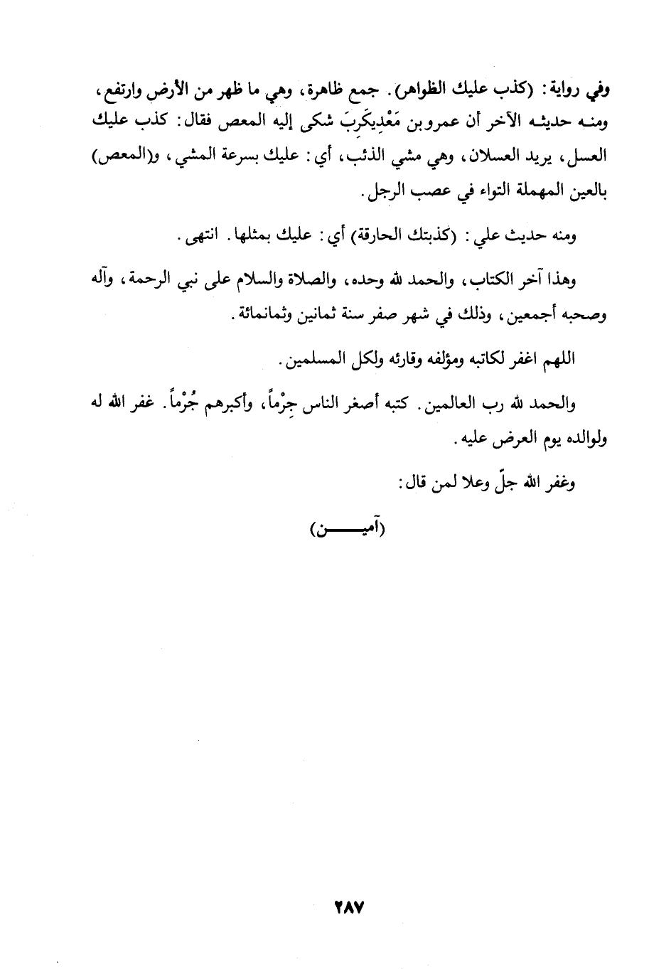 وهذا آخر الكتاب، والحمد لله وحده، والصلاة والسلام على نبي الرحمة، وآله وصحبه أجمعين، وذلك في شهر صفر سنة ثمانين وثمانمائة.