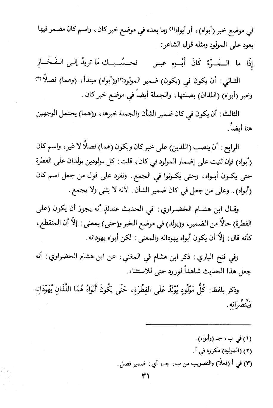 الرابع: أن ينصب (اللذين) على خبر كان ويكون (هما) فصلاً لا غير، واسم كان (أبواه) فإن ثنيت على إضمار المولود في كان، قلت: كل مولودين يولدان على الفطرة حتى يكون أبواه، وحتى يكونوا في الجمع. وتفرد على قول من جعل اسم كان (أبواه). وعلى من جعل في كان ضمير الشأن، لأنه لا يثنى ولا يجمع.