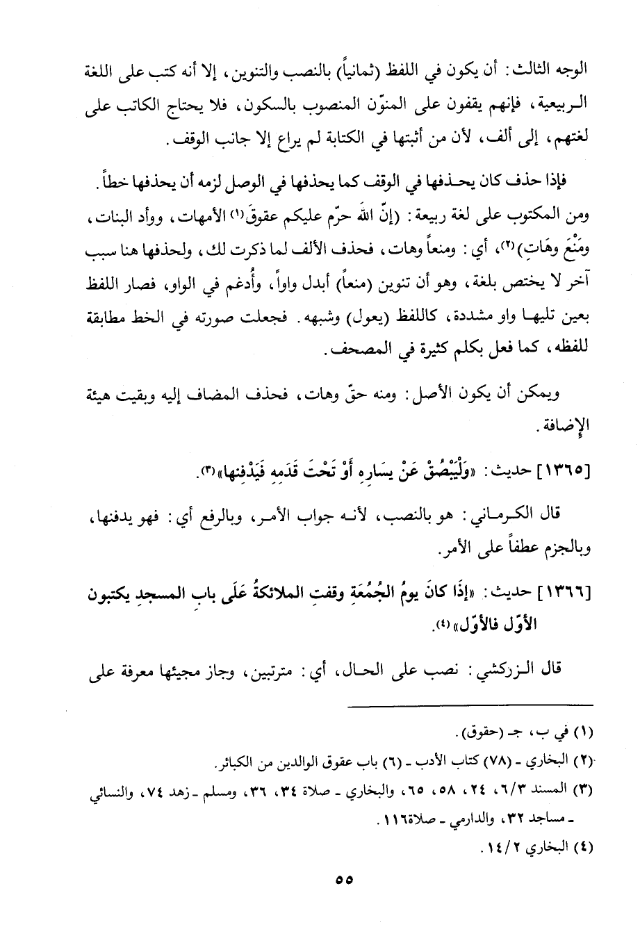ومن المكتوب على لغة ربيعة: (إن الله حرم عليكم عقوق الامهات، ووأد البنات، ومنع وهات)، أي: ومنعًا وهات، فحذف الألف لما ذكرت لك. ولحذفها هنا سبب آخر لا يختص بلغة، وهو أن تنويق "منعًا" أبدل واوًا وأدغم في الواو، فصار اللفظ بعين تليها واو مشددة، كاللفظ (يعول) وشبهه، فجعلت صورته في الخط مطابقة للفظه، كما فعل بكلم كثيرة في المصحف.