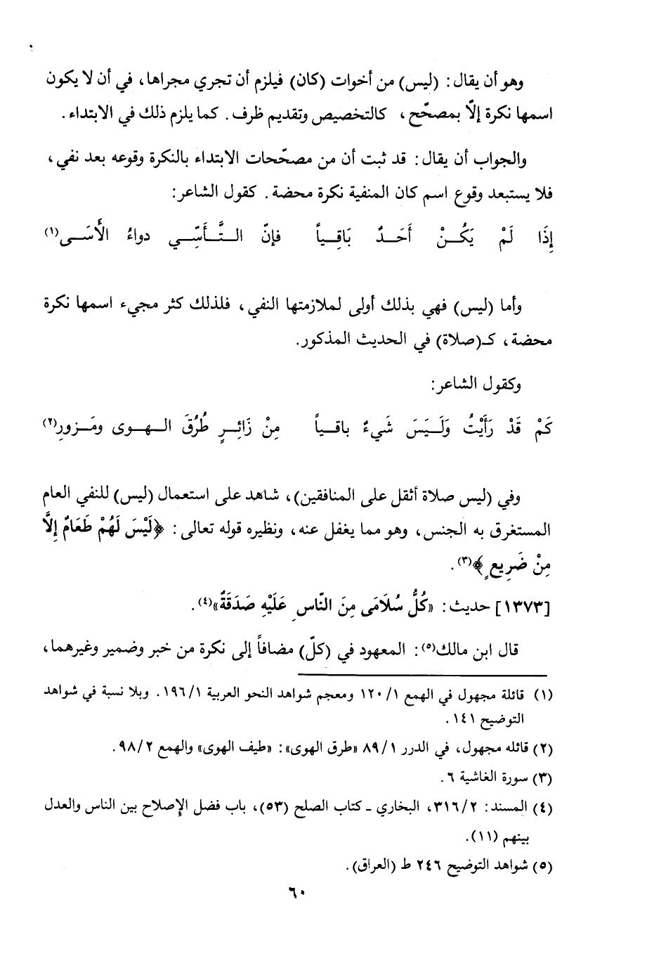 وأما"ليس" فهي بذلك أولى، لملازمتها النفي، فلذلك كثر مجيء اسمها نكرة محضة، ك "صلاة" في الحديث المذكور، وكقول الشاعر: