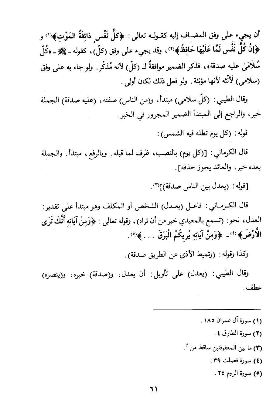 وقال الطيبي: (كل سلامى) مبتدأ، و (من الناس) صفته، (عليه صدقة) الجملة خبر، والراجع إلى المبتدأ الضمير المجرور في الخبر.