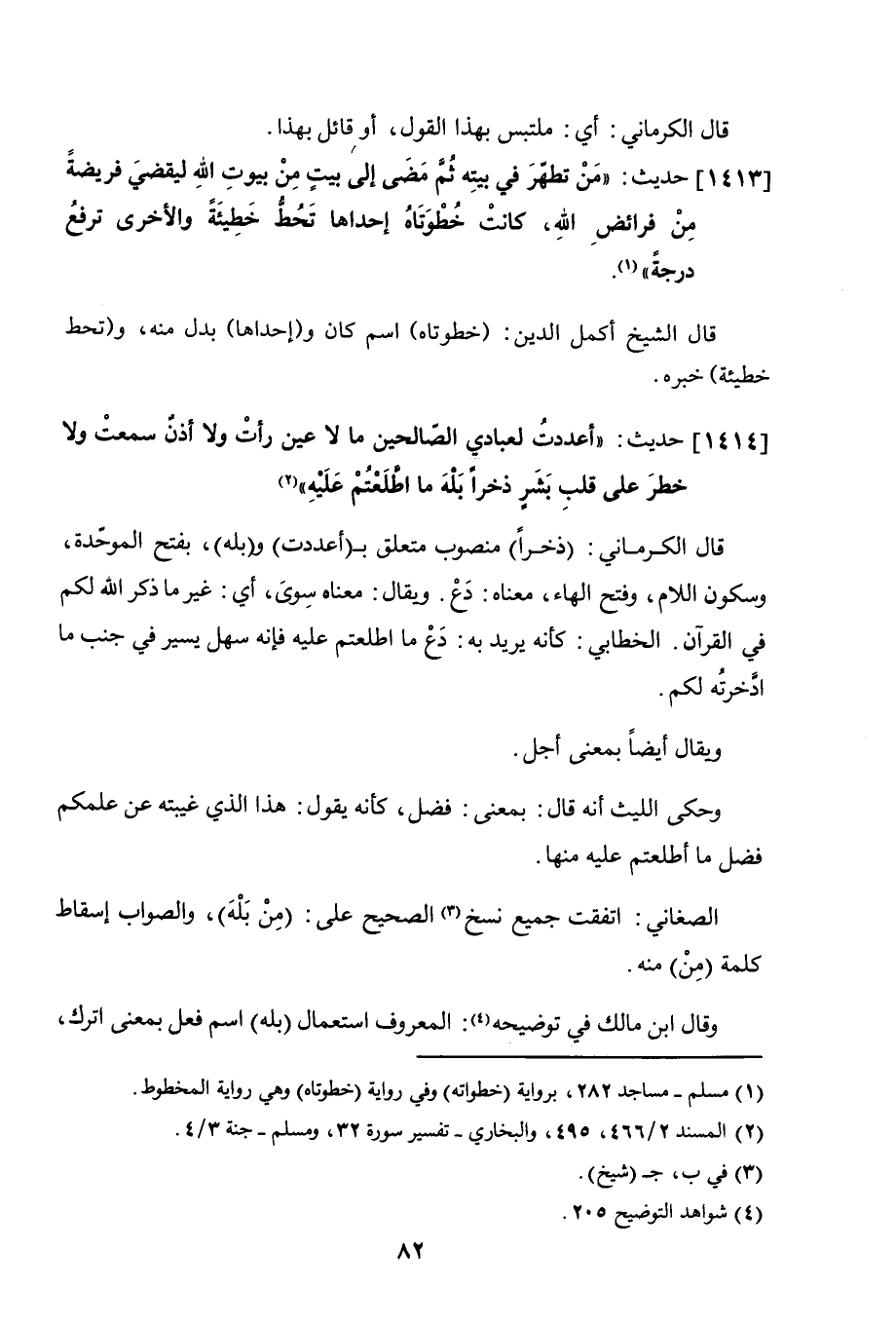 قال الكرماني: (ذخرًا) منصوب متعلق بـ (أعددت) و (بله)، بفتح الموحدة، وسكون اللام، وفتح الهاء، معناه: دَعْ. ويقال: معناه سوى، أي: غير ما ذكر الله لكم في القرآن. الخطابي: كأنه يريد به: دع ما اطلعتم عليه فإنه سهل يسير في جنب ما ادخرته لكم.