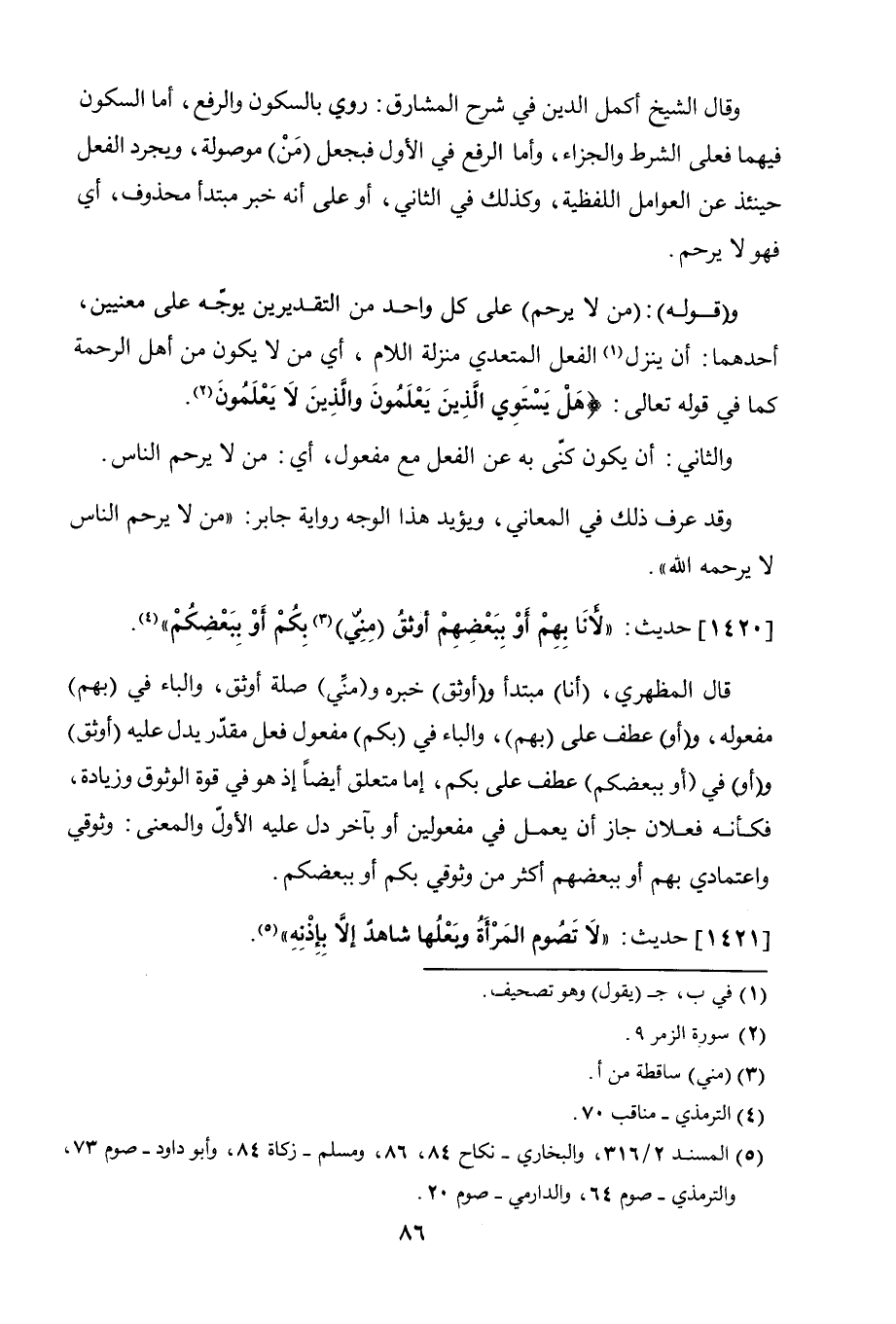 وقال الشيخ أكمل الدين في شرح المشارق: روي بالسكون والرفع، أما السكون فيهما فعلى الشرط والجزاء، وأما الرفع في الأول فبجعل (من) موصولة، ويجرد الفعل حينئذ عن العوامل اللفظية، وكذلك في الثاني، أو على أنه خبر مبتدأ محذوف، أي فهو لا يرحم.