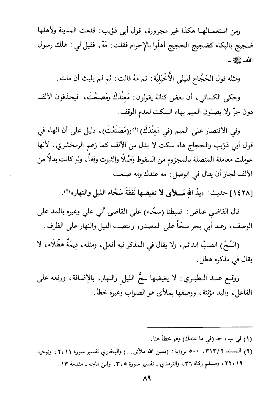 ووقع عند الطبري: لا يغيضها سحُّ الليل والنهار، بالإضافة، ورفعه على الفاعل، واليد مؤنثة، ووصفها بملأى هو الصواب وغيره خطأ.
