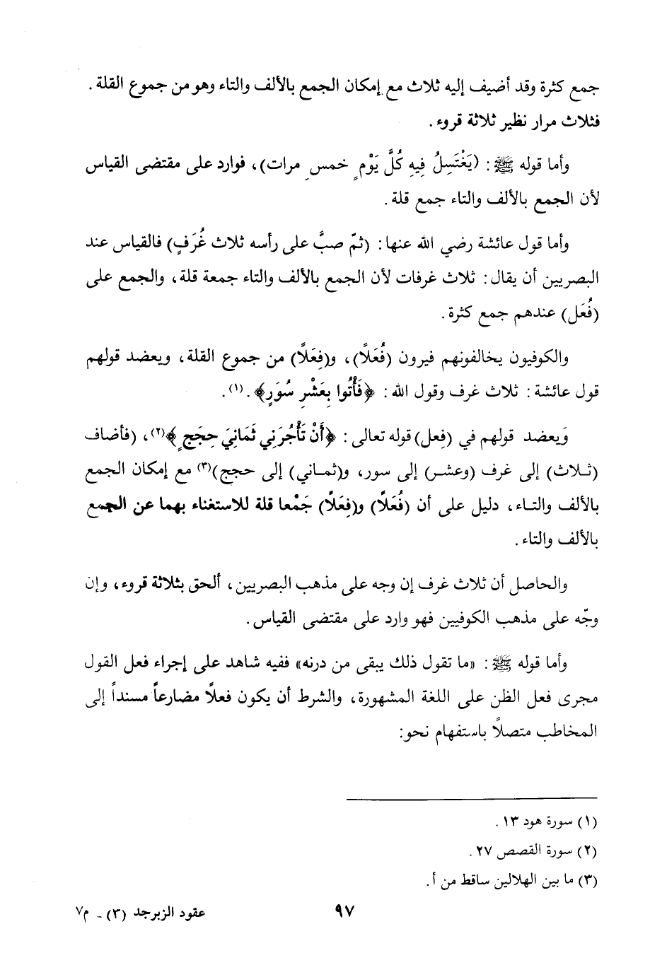 وأما قول عائشة رضي الله عنها: "ثم صب على رأسه ثلاث غرف" فالقياس عند البصريين أن يقال: ثلاث غرفات، لأن الجمع بالألف والتاء جمع قلة، والجمع على"فُعَل" عندهم جمع كثرة.