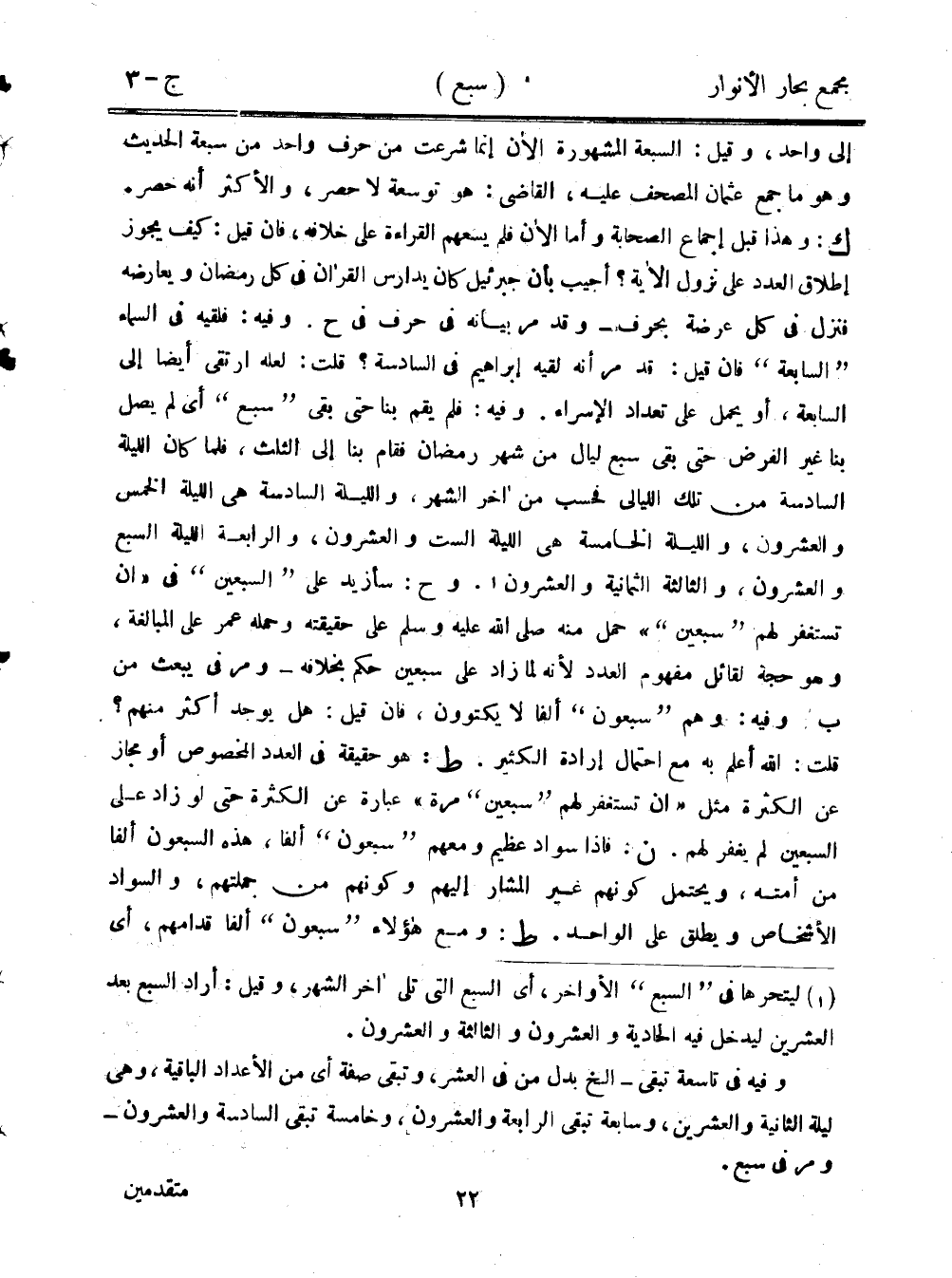 إلى واحد، وقيل: السبعة المشهورة لأن إنما شرعت من حرف واحد من سبعة الحديث وهو ما جمع عثمان المصحف عليه، القاضى: هو توسعة لا حصر، والأكثر أنه حصر. ك: وهذا قبل إجماع الصحابة وأما الآن فلم يسعهم القراءة على خلافه، فان قيل: كيف يجوز إطلاق العدد على نزول الآية؟ أجيب بأن جبرئيل كان يدارس القرآن في كل رمضان ويعارضه فنزل في كل عرضة بحرف - وقد مر بيانه في حرف في ح. وفيه: فلقيه في السماء "السابعة" فان قيل: قد مر أنه لقيه إبراهيم في السادسة؟ قلت: لعله ارتقى أيضًا إلى السابعة، أو يحمل على تعداد الإسراء. وفيه: فلم يقم بنا حتى بقى "سبع" أي لم يصل بنا غير الفرض حتى بقى سبع ليال من شهر رمضان فقام بنا إلى الثلث، فلما كان الليلة السادسة من تلك الليالى فحسب من آخر الشهر، والليلة السادسة هي الليلة الخمس والعشرون، والليلة الخامسة هي الليلة الست والعشرون، والرابعة الليلة السبع والعشرون، والثالثة الثامنة والعشرون. وح: سأزيد على "السبعين" في ((أن تستغفر لهم "سبعين")) حمل منه صلى الله عليه وسلم على حقيقته وحمل عمر على المبالغة، وهو حجة لقائل مفهوم العدد لأنه لما زاد على سبعين حكم بخلافه - ومر في يبعث من ب: وفيه: وهم "سبعون" ألفًا لا يكتوون، فان قيل: هل يوجد أكثر منهم؟ قلت: الله أعلم به مع احتمال إرادة الكثير. ط: هو حقيقة في العدد المخصوص أو مجاز عن الكثرة مثل ((أن تستغفر لهم "سبعين" مرة)) عبارة عن الكثرة حتى لو زاد على السبعين لم يغفر لهم. ن: فإذا سواد عظيم ومعهم "سبعون" ألفا، هذه السبعون ألفًا من أمته، ويحتمل كونهم غير المشار إليهم وكونهم من جملتهم، والسواد الأشخاص ويطلق على الواحد. ط: ومع هؤلاء "سبعون" ألفًا قدامهم، أي