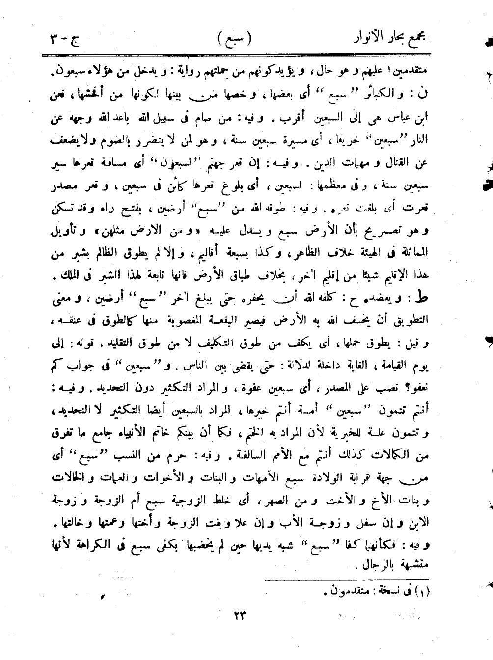 متقدمين عليهم وهو حال، ويؤيد كونهم من جملتهم رواية: ويدخل من هؤلاء سبعون. ن: والكبائر "سبع" أي بعضها، وخصها من بينها لكونها من أفحشها، فعن ابن عباس هي إلى السبعين أقرب. وفيه: من صام في سبيل الله باعد الله وجهه عن النار "سبعين" خريفًا، أي مسيرة سبعين سنة، وهو لمن لا يتضرر بالصوم ولا يضعف عن القتال ومهمات الدين. وفيه: إن قعر جهنم "لسبعون" أي مسافة قعرها سير سبعين سنة، وفي معظمها: لسبعين، أي بلوغ قعرها كائن في سبعين، وقعر مصدر قعرت أي بلغت قعره. وفيه: طوقه الله من "سبع" أرضيين، بفتح راء وقد تسكن وهو تصريح بأن الأرض سبع ويدل عليه "ومن الأرض مثلهن" وتأويل المماثلة في الهيئة خلاف الظاهر، وكذا بسبعة أقاليم، وإلا لم يطوق الظالم بشبر من هذا الإقليم شيئا من إقليم آخر، بخلاف طباق الأرض فإنها تابعة لهذا الشبر في الملك. ط: ويعضد ح: كلفه الله أن يحفره حتى يبلغ آخر "سبع" أرضيين، ومعنى التطويق أن يخسف الله به الأرض فيصير البقعة المغصوبة منها كالطوق في عنقه، وقيل: يطوق حملها، أي يكلف من طوق التكليف لا من طوق التقليد، قوله: إلى يوم القيامة، الغاية داخلة لدلالة: حتى يقضى بين الناس. و"سبعين" في جواب كم تعفو؟ نصب على المصدر، أي سبعين عفوة، والمراد التكثير دون التحديد. وفيه: أنتم تتمون "سبعين" أمة أنتم خيرها، المراد بالسبعين أيضا التكثير لا التحديد، وتتمون علة للخبرية لأن المراد به الختم، فكما أن بينكم خاتم الأنبياء جامع ما تفرق من الكمالات كذلك أنتم من الأمم السالفة. وفيه: حرم من النسب "سبع" أي من جهة قرابة الولادة سبع الأمهات والبنات والأخوات والعمات والخالات وبنات الأخ والأخت ومن الصهر، أي خلط الزوجية سبع أم الزوجة وزوجة الابن وإن سفل وزوجة الأب وإن علا وبنت الزوجة وأختها وعمتها وخالتها. وفيه: فكأنهما كفا "سبع" شبه يديها حين لم يخضبها بكفي سبع في الكراهة لأنها متشبهة بالرجال.