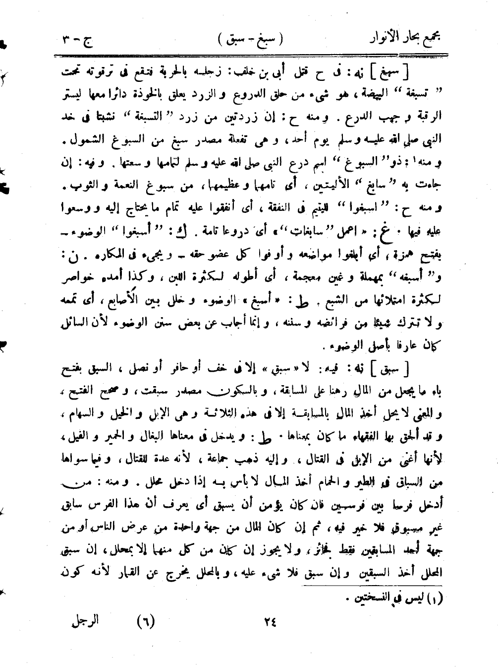 [سبق] نه: فيه: لا "سبق" إلا في خف أو حافر أو نصلى، السبق بفتح باء ما يجعل من المال رهنا على المسابقة، وبالسكون مصدر سبقت، وصحح الفتح، والمعنى لا يحل أخذ المال بالمسابقة إلا في هذه الثلاثة وهى الإبل والخيل والسهام، وقد ألحق بها الفقهاء ما كان بمعناها. ط: ويدخل في معناها البغال والحمير والفيل، لأنها أغنى من الفيل في القتال، وإليه ذهب جماعة، لأنه عدة للقتال، وفيما سواها من السباق في الطير والحمام أخذ المال لا بأس به إذا دخل محلل. ومنه: من أدخل فرسا بين فرسين فان كان يؤمن أن يسبق أي يعرف أن هذا الفرس سابق غير مسبوق فلا خير فيه، ثم إن كان المال من جهة واحدة من عرض الناس أو من جهة أحد المسابقين فقط فجائز، وإن سبق فلا شئ عليه، وبالمحلل يخرج عن القمار لأنه كون