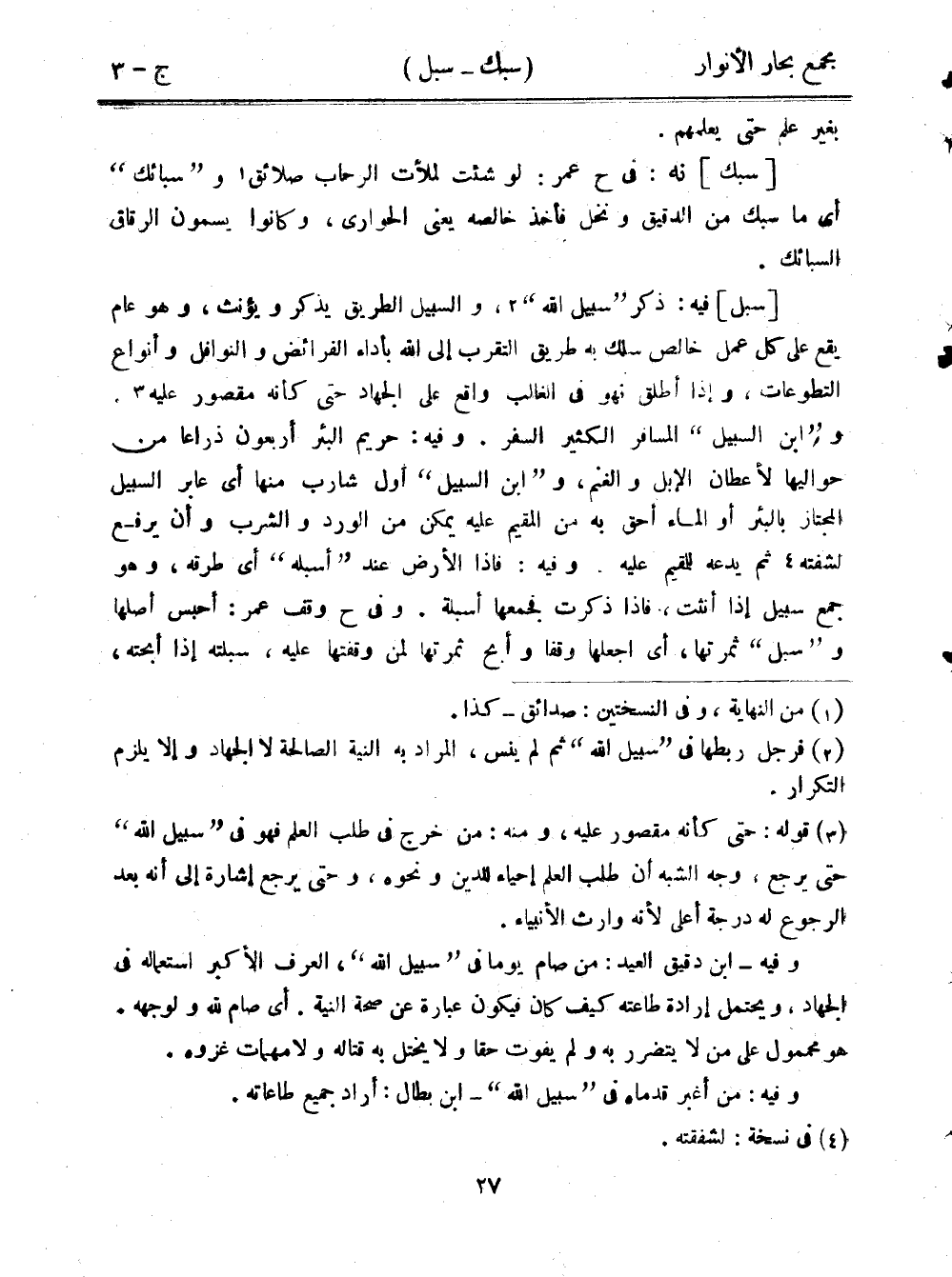 [سبل] فيه: ذكر "سبيل الله"، والسبيل الطريق يذكر ويؤنث، وهو عام يقع على كل عمر خالص سلك به طريق التقرب إلى الله بأداء الفرائض والنوافل وأنواع التطوعات، وإذا أطلق فهو في الغالب واقع على الجهاد حتى كأنه مقصور عليه. و"ابن السبيل" المسافر الكثير السفر. وفيه: حريم البئر أربعون ذراعًا من حواليها لأعطان الإبل والغنم، و"ابن السبيل" أول شارب منها أي عابر السبيل المجتاز بالبئر أو الماء أحق به من المقيم عليه يمكن من الورد والشرب وأن يرفع لشفته 4 ثم يدعه للمقيم عليه. وفيه: فإذا الأرض عند "أسبله" أي طرقه، وهو جمع سبيل إذا أنثت، فإذا ذكرت فجمعها أسبلة. وفي ح وقف عمر: أحبس أصلها و"سبل" ثمرتها، أي اجعلها وقفا وأبح ثمرتها لمن وقفتها عليه، سبلته إذا أبحته،