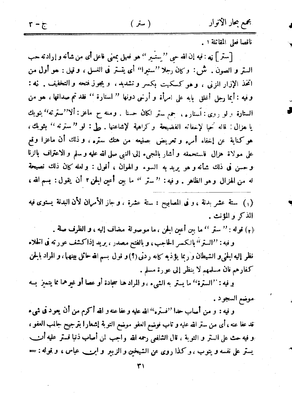 [ستر] نه: فيه إن الله حي "ستير" هو فعيل بمعنى فاعل أي من شأنه وإرادته حب الستر والصون. ش: وكان رجلًا "ستيرا" أي يتستر في الغسل، وقيل: هو أول من اتخذ الإزار المزنى، وهو كسكيت بكسر وتشديد، ويجوز فتحه والتخفيف. نه: وفيه: أيما رجل أغلق بابه على امرأة وأرخى دونها "استارة" فقد تم صداقها، هو من الستارة ولو روى: استاره، جمع ستر لكان حسنا. ومنه ح ماعز: ألا "سترته" بثوبك يا هزال قاله حبًا لإخفائه الفضيحة وكراهية لإشاعتها. ط: لو "سترته" بثوبك، هو كناية عن إخفاء أمره وتعريض بصنيعه من هتك ستره، وذلك أن ماعزًا وقع على مولاة هزال فاستحمقه وأشار بالمجئ إلى النبي صلى الله عليه وسلم والاعتراف بالزنا وحسن في ذلك شأنه وهو يريد به السوء والهوان، أقول: ولعله كان ذلك نصيحة له من الهزال وهو الظاهر. وفيه: "ستر" ما بين أعين الجن أن يقول: بسم الله،