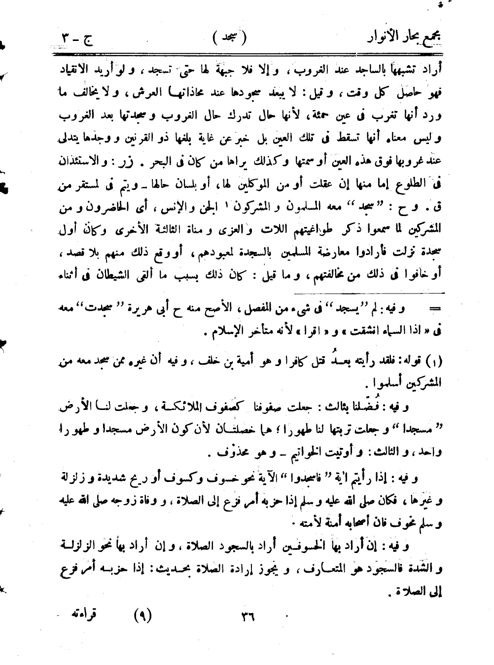 أراد تشبهها بالساجد عند الغروب، وإلا فلا جبهة لها حتى تسجد، ولو أريد الانقياد فهو حاصل كل وقت، وقيل: لا يبعد سجودها عند محاذاتها العرش، ولا يخالف ما ورد أنها تغرب في عين حمئة، لأنها حال تدرك حال الغروب وسجدتها بعد الغروب وليس معناه أنها تسقط في تلك العين بل خبر عن غاية بلغها ذو القرنين ووجدها يتدلى عند غروبها فوق هذه العين أو سمتها وكذلك يراها من كان في البحر. زر: والاستئذان في الطلوع إما منها إن علقت أو من الموكلين لها، أو بلسان حالها - ويتم في لمستقر من ق. وح: "سجد" معه المسلمون والمشركون الجن والإنس، أي الحاضرون ومن المشركين لما سمعوا ذكر طواغيتهم اللات والعزى ومناة الثالثة الأخرى وكان أول سجدة نزلت فأرادوا معارضة المسلمين بالسجدة لمعبودهم، أو وقع ذلك منهم بلا قصد، أو خافوا في ذلك من مخالفتهم، وما قيل: كان ذلك بسبب ما ألقى الشيطان في أثناء
