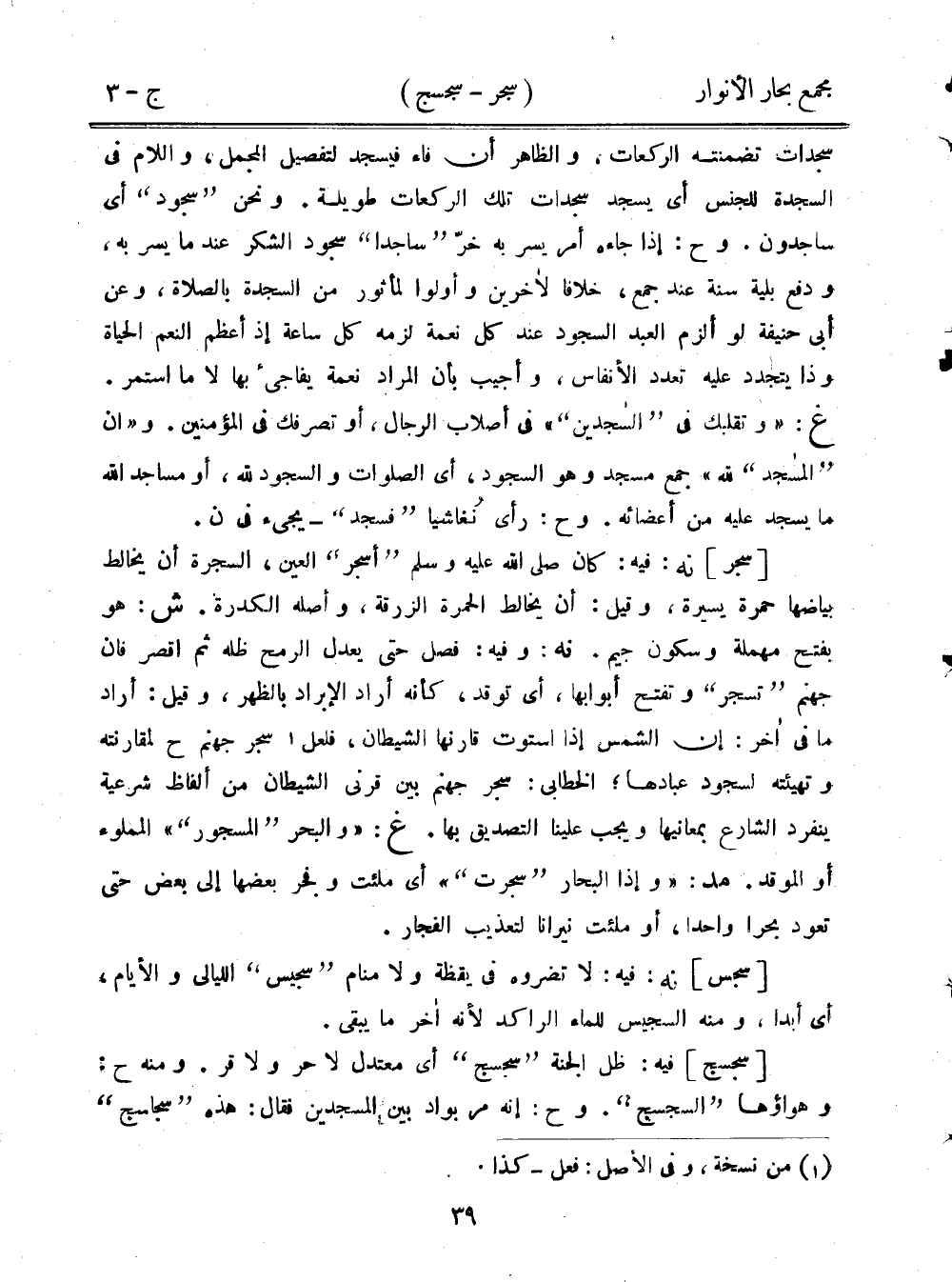 [سجر] نه: فيه: كان صلى الله عليه وسلم "أسجر" العين، السجرة أن يخالط بياضها حمرة يسيرة، وقيل: أن يخالط الحمرة الزرقة، وأصله الكدرة. ش: هو بفتح مهملة وسكون جيم. نه: وفيه: فصل حتى يعدل الرمح ظله ثم اقصر فإن جهنم "تسجر" وتفتح أبوابها، أي توقد، كأنه أراد الإبراد بالظهر، وقيل: أراد ما في أخر: إن الشمس إذا استوت قارنها الشيطان، فلعل سجر جهنم ح لمقارنته وتهيئته لسجود عبادها؛ الخطابي: سجر جهنم بين قرني الشيطان من ألفاظ شرعية ينفرد الشارع بمعانيها ويجب علينا التصديق بها. غ: ((والبحر "المسجور")) المملوء أو الموقد. مد: ((وإذا البحار "سجرت")) أي ملئت وفجر بعضها إلى بعض حتى تعود بحرًا واحدًا، أو ملئت نيرانًا لتعذيب الفجار.