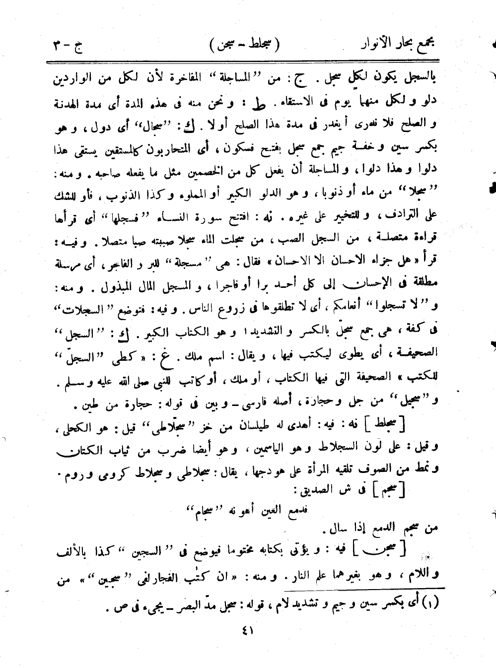 بالسجل يكون لكل سجل. ج: من "المساجلة" المفاخرة لأن لكل من الواردين دلو ولكل منهما يوم في الاستقاء. ط: ونحن منه في هذه المدة أي مدة الهدنة والصلح فلا ندري أيغدر في مدة هذا الصلح أو لا. ك: "سجال" أي دول، وهو بكسر سين وخفة جيم جمع سجل بفتح فسكون، أي المتحاربون كالمستقين يستقي هذا دلوًا وهذا دلوًا، والمساجلة أن يفعل كل من الخصمين مثل ما يفعله صاحبه. ومنه: "سجلا" من ماء أو ذنوبًا، وهو الدلو الكبير أو المملوء وكذا الذنوب، فأو للشك على الترادف، وللتخيير على غيره. نه: افتتح سورة النساء "فسجلها" أي قرأها قراءة متصلة، من السجل الصب، من سجلت الماء سجلًا صببته صبًا متصلًا. وفيه: مطلقة في الإحسان إلى كل أحد برًا أو فاجرًا، والمسجل المال المبذول. ومنه: و"لا تسجلوا" أنعامكم، أي لا تطلقوها في زروع الناس. وفيه: فتوضع "السجلات" في كفة، هي جمع سجل بالكسر والتشديد وهو الكتاب الكبير. ك: "السجل" الصحيفة، أي يطوى لكتب فيها، ويقال: اسم ملك. غ: ((كطي "السجل" للكتب)) الصحيفة التي فيها الكتاب، أو ملك، أو كاتب للنبي صلى الله عليه وسلم. و"سجيل" من جل وحجازة، أصله فارسي - وبين في قوله: حجارة من طين.