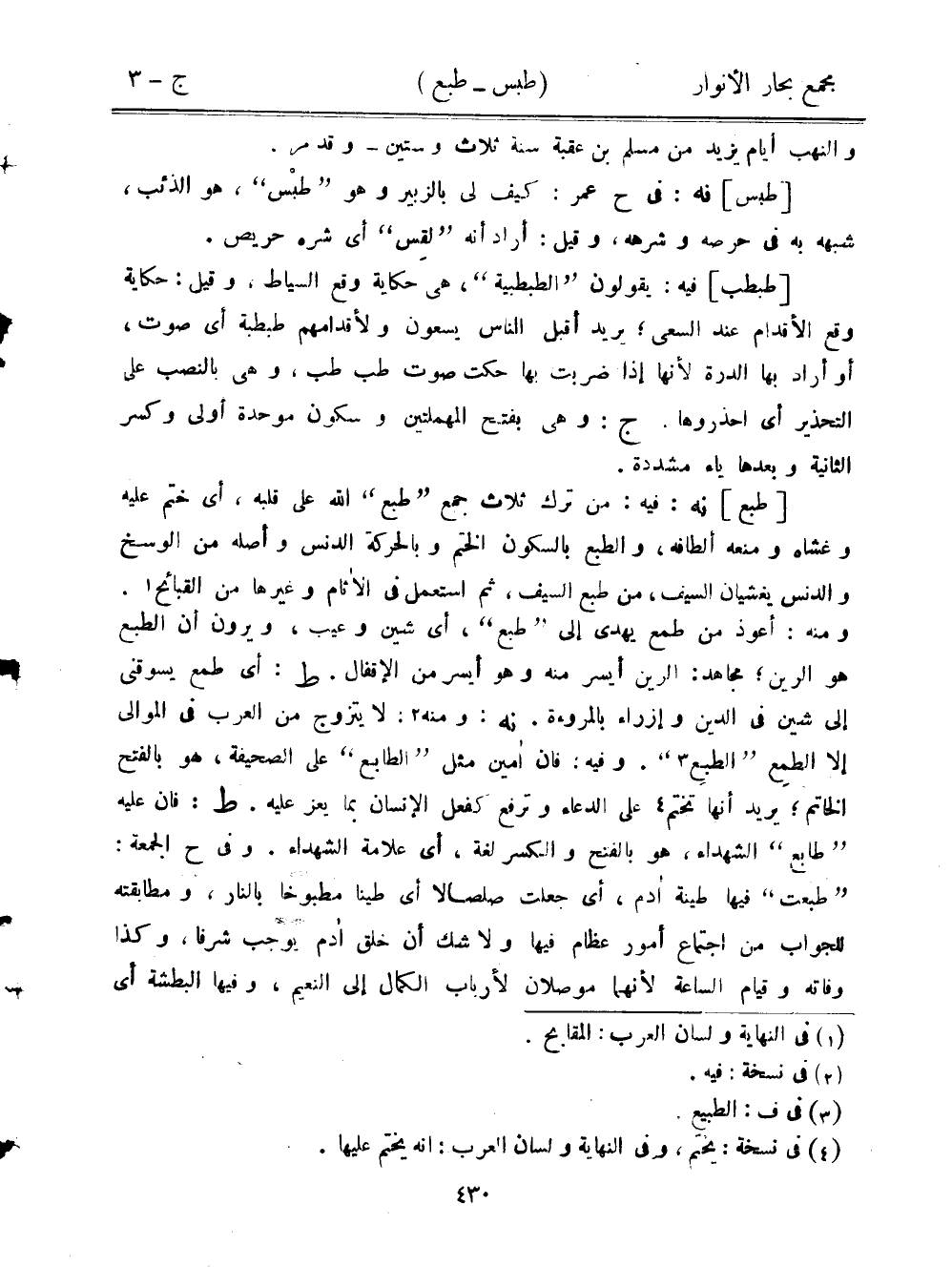 [طبع] نه: فيه: من ترك ثلاث جمع "طبع" الله على قلبه، أي ختم عليه وغشاه ومنعه ألطافه، والطبع بالسكون الختم وبالحركة الدنس وأصله من الوسخ والدنس يغشيان السيف، من طبع السيف، ثم استعمل في الأنام وغيرها من القبائح. ومنه: أعوذ من طمع يهدي إلى "طبع"، أي شين وعيب، ويرون أن الطبع هو الرين؛ مجاهد: الرين أيسر منه وهو أيسر من الإقفال. ط: أي طمع يسوقني إلى شين في الدين وإزراء بالمروءة. نه: ومنه: لا يتزوج من العرب في الموالي إلا الطمع "الطبع". وفيه: فإن أمين مثل "الطابع" على الصحيفة، هو بالفتح الخاتم؛ يريد أنها تختم على الدعاء وترفع كفعل الإنسان بما يعز عليه. ط: فإن عليه "طابع" الشهداء، هو بالفتح والكسر لغة، أي علامة الشهداء. وفي ح الجمعة: "طبعت" فيها طينة آدم، أي جعلت صلصالًا أي طينًا مطبوخًا بالنار، ومطابقته للجواب من اجتماع أمور عظام فيها ولا شك أن خلق آدم يوجب شرفًا، وكذا وفاته وقيام الساعة لأنهما موصلان لأرباب الكمال إلى النعيم، وفيها البطشة أي