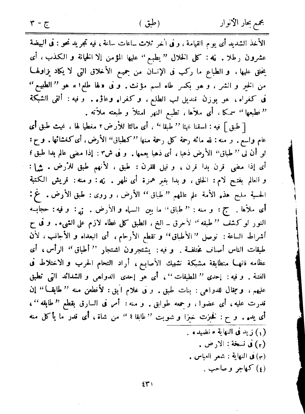 [طبق] فيه: اسقنا غيثًا "طبقًا"، أي مالئًا للأرض مغطيًا لها، غيث طبق أي عام واسع. ومنه: لله مائة رحمة كل رحمة منها "كطباق" الأرض، أي كغشائها. وح: لو أن لي "طباق" الأرض ذهبًا، أي ذهبًا يعمها. وفي ش: إذا مضى عالم بدا طبق؛ أي إذا مضى قرن بدا قرن، وقيل للقرن: طبق، لأنهم طبق للأرض. شا: والعالم بفتح لام: الخلق، وبدا بغير همزة أي ظهر. نه: ومنه: قريش الكتبة الحسبة ملح هذه الأمة علم عالمهم "طباق" الأرض، وروى: طبق الأرض. غ: أي ملأها. ج: ومنه: "طباق" ما بين السماء والأرض. نه: وفيه: حجابه النور لو كشف "طبقه" لأحرق- إلخ، الطبق كل غطاء لازم على الشيء. وفي ح أشراط الساعة: توصل "الأطباق" وتقطع الأرحام، أي البعداء والأجانب، لأن طبقات الناس أصناف مختلفة. وفيه: يشتجرون اشتجار "أطباق" الرأس، أي عظامه فإنها متطابقة مشبكة تشبيك الأصابع، أراد التحام الحرب والاختلاط في الفتنة. وفيه: إحدى "المطبقات"، أي هو إحدى الدواهي والشدائد التي تطبق عليهم، ويقال للدواهي: بنات طبق. وفي غلام أبق: لأقطعن منه "طابقًا" إن قدرت عليه، أي عضوا، وجمعه طوابق. ومنه: أمر في السارق بقطع "طابقه"، أي يده. وح: فخبزت خبزًا وشويت "طابقًا" من شاة، أي قدر ما يأكل منه