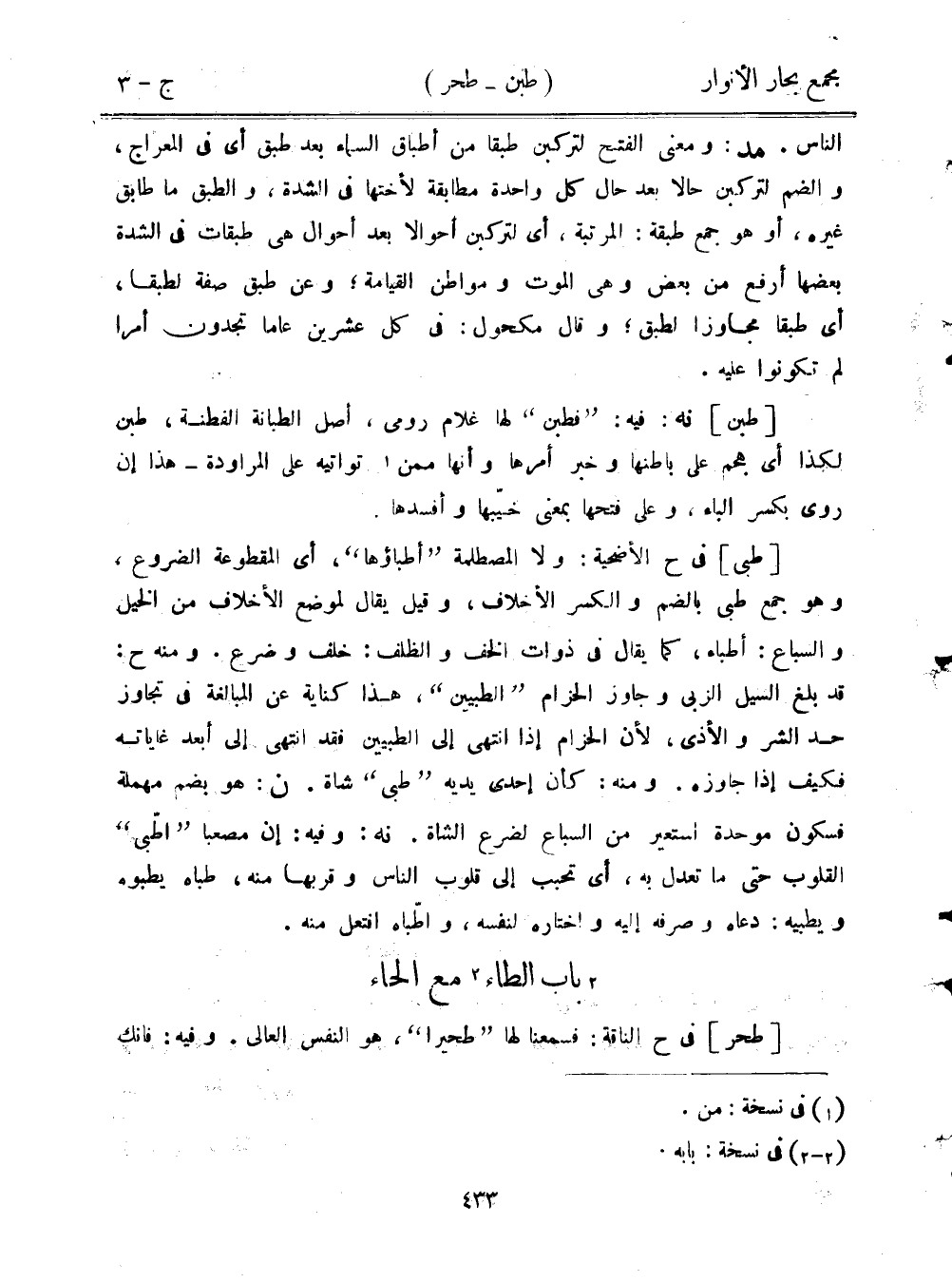 [طبي] في ح الأضحية: ولا المصطلمة "أطباؤها"، أي المقطوعة الضروع، وهو جمع طبي بالضم والكسر الأخلاف، وقيل يقال لموضع الأخلاف من الخيل والسباع: أطباء، كما يقال في ذوات الخف والظلف: خلف وضرع. ومنه ح: قد بلغ السيل الزبي وجاوز الحزام "الطبيين"، هذا كناية عن المبالغة في تجاوز حد الشر والأذى، لأن الحزام إذا انتهى إلى الطبيين فقد انتهى إلى أبعد غاياته فكيف إذا جاوزه. ومنه: كأن إحدى يديه "طبي" شاة. ن: هو بضم مهملة فسكون موحدة أستعير من السباع لضرع الشاة. نه: وفيه: إن مصعبا "أطبي" القلوب حتى ما تعدل به، أي تحبب إلى قلوب الناس وقربها منه، طباه يطبوه ويطبيه: دعاه وصرفه إليه واختاره لنفسه، واطباه افتعل منه.