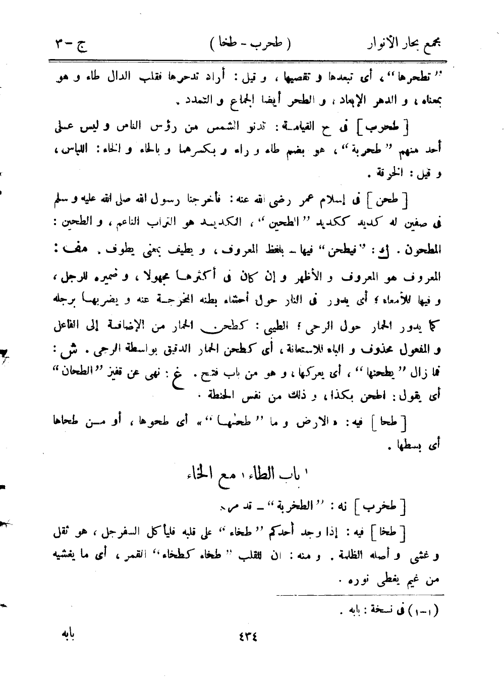 [طحن] في إسلام عمر رضي الله عنه: فأخرجنا رسول الله صلى الله عليه وسلم في صفين له كديد ككديد "الطحين"، الكديد هو التراب الناعم، والطحين: المطحون. ك: "فيطحن" فيها- بلفظ المعروف، ويطيف بمعنى يطوف. مف: المعروف هو المعروف والأظهر وإن كنا في أكثرها مجهولًا، وضميره للرجل، وفيها للأمعاء، أي يدور في النار حول أحشاء بطنه المخرجة عنه ويضربها برجله كما يدور الحمار حول الرحى؛ الطيبي: كطحن الحمار من الإضافة إلى الفاعل والمفعول محذوف والباء للاستعانة، أي كطحن الحمار الدقيق بواسطة الرحى. ش: فما زال "يطحنها"، أي يعركها، وهو من باب فتح. غ: نهى عن قفيز "الطحان" أي يقول: اطحن بكذا، وذلك من نفس الحنطة.