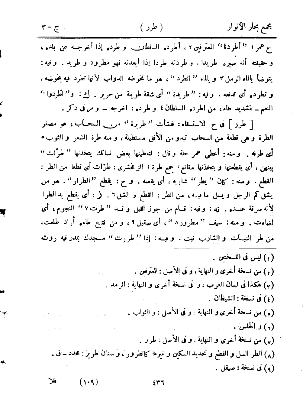 ح عمر "أطردنا" المعترفين، أطرده السلطان وطرده إذا أخرجه عن بلده، وحقيقته أنه صيره طريدًا، وطردته طردًا إذا أبعدته فهو مطرود وطريد. وفيه: يتوضأ بالماء الرمل وبالماء "الطرد"، هو ما تخوضه الدواب لأنها تطرد فيه بخوضه، وتطرده أي تدفعه. وفيه: "طريدة" أي شقة طويلة من حرير. ك: و"اطردوا" النعم- بتشديد طاء، من اطرده السلطان وطرده: اخرجه- ومر في ذكر.
