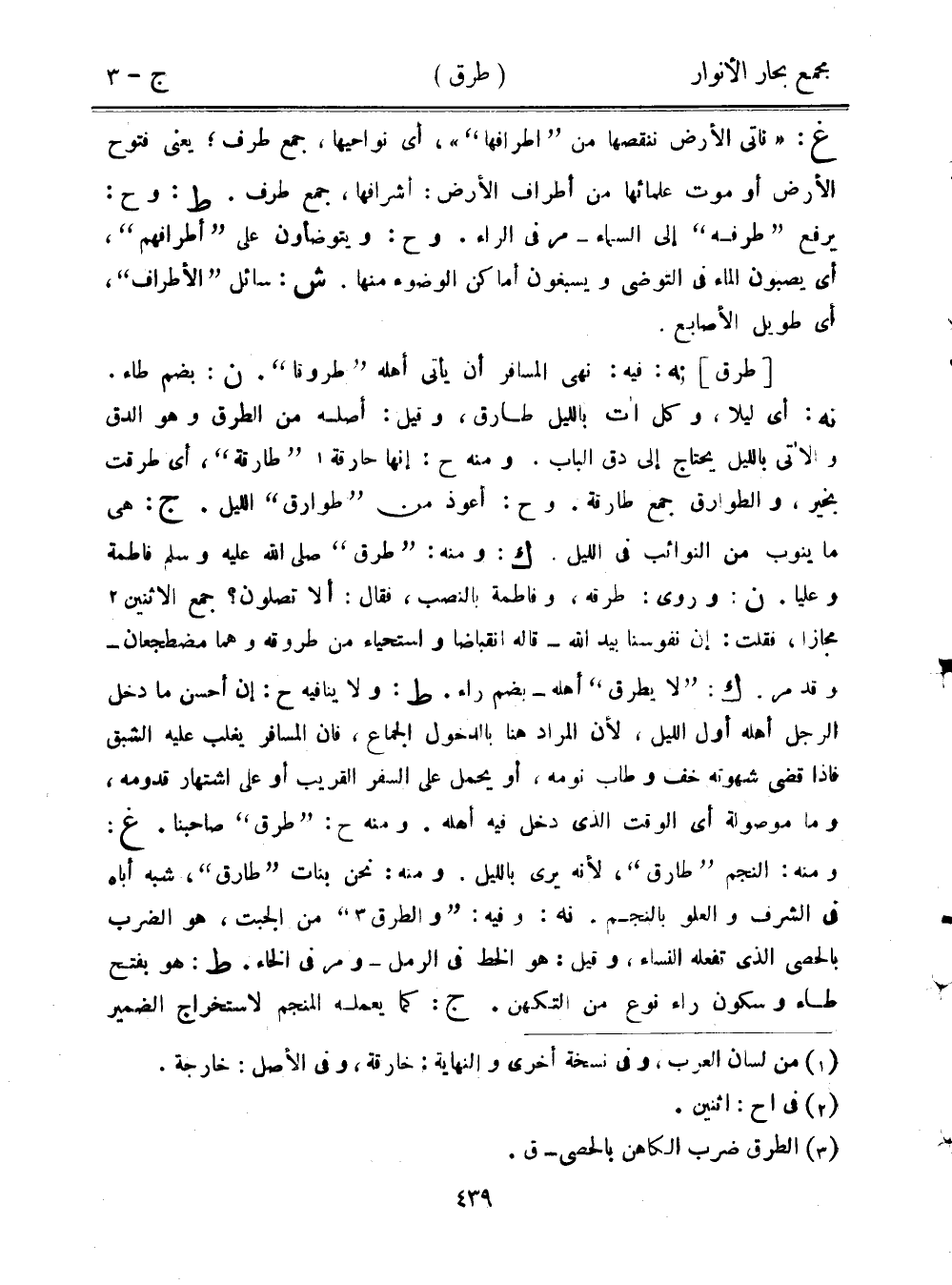 [طرق] نه: فيه: نهى المسافر أن يأتي أهله "طروقًا". ن: بضم طاء. نه: أي ليلًا، وكل آت بالليل طارق، وقيل: أصله من الطرق وهو الدق والآتي بالليل يحتاج إلى دق الباب. ومنه ح: إنها حارقة "طارقة"، أي طرقت بخير، والطوارق جمع طارقة. وح: أعوذ من "طوارق" الليل. ج: هي ما ينوب من النوائب في الليل. ك: ومنه: "طرق" صلى الله عليه وسلم فاطمة وعليا. ن: وروى: طرقه، وفاطمة بالنصب، فقال: ألا تصلون؟ جمع الاثنين مجازًا، فقلت إن نفوسنا بيد الله- قاله انقباضًا واستحياء من طروقه وهما مضطجعان- وقد مر. ك: "لا يطرق" أهله- بضم راء. ط: ولا ينافيه ح: إن أحسن ما دخل الرجل أهله أول الليل، لأن المراد هنا بالدخول الجماع، فإن المسافر يغلب عليه الشبق فإذا قضى شهوته خف وطاب نومه، أو يحمل على السفر القريب أو على اشتهار قدومه، وما موصولة أي الوقت الذي دخل فيه أهله. ومنه ح: "طرق" صاحبنا. غ: ومنه: النجم "طارق"، لأنه يرى بالليل. ومنه: نحن بنات "طارق"، شبه أباه في الشرف والعلو بالنجم. نه: وفيه: "والطرق" من الجبت، هو الضرب بالحصى الذي تفعله النساء، وقيل: هو الخط في الرمل- ومر في الخاء. ط: هو بفتح طاء وسكون راء نوع من التكهن. ج: كما يعمله المنجم لاستخراج الضمير
