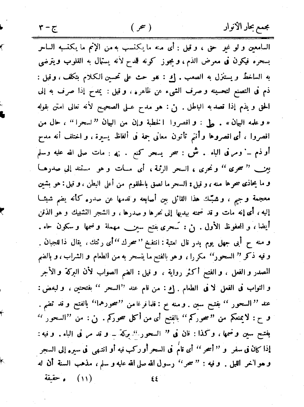 السامعين ولو غير حق، وقيل: أي منه ما يكتسب به من الإثم ما يكتسبه الساحر بسحره فيكون في معرض الذم، ويجوز كونه للمدح لأنه يستمال به القلوب ويترضى به الساخط ويستنزل به الصعب. ك: هو حيث على تحسين الكلام بتكلف، وقيل: ذم في التصنيع لتحسينه وصرف الشيء عن ظاهره، وقيل: يمدح إذا صرف به إلى الحق ويذم إذا قصد به الباطل. ن: هو مدح على الصحيح لأنه تعلى امتن بقوله "وعلمه البيان". ط: واقصروا الخطبة وإن من البيان "لسحرًا"، حال من اقصروا، أي اقصروها وأنتم تأتون معاني جمة في ألفاظ يسيرة، واختلف أنه مدح أو ذم - ومر في الباء. ش: سحر يسحر كمنع. نه: مات صلى الله عليه وسلم بين "سحري" ونحري، السحر الرئة، أي مات وهو مستند إلى صدرها وما يحاذي سحرها منه، وقيل: السحر ما لصق بالحلقوم من أعلى البطن، وقيل: هو بشين معجمة وجيم، وشبك هذا القائل بين أصابعه وقدمها عن صدره كأنه يضمن شيئًا إليه، أي إنه مات وقد ضمته بيديها إلى نحرها وصدرها، والشجر التشبيك وهو الذقن أيضًا، والمحفوظ الأول. ن: سحري بفتح سين مهملمة وضمها وسكون حاء. ومنه ح أبي جهل يوم بدر قال لعتبة: انتفخ "سحرك" أي رئتك، يقال ذا للجبان. وفيه ذكر "السحور" مكررًا، وهو بالفتح ما يتسحر به من الطعام والشراب، وبالضم المصدر والفعل، والفتح أكثر رواية، وقيل: الضم الصواب لأن البركة والأجر والثواب في الفعل لا في الطعام. ك: من قام عند "السحر" بفتحتين، ولبعض: عند "السحور" بفتح سين. ومنه ح: فلما فرغا من "سحورهما" بالفتح وقد تضم. وح: لا يمنعكم من "سحوركم" بالفتح أي من أكل سحوركم. ن: من "السحور" بفتح سين وضمها، وكذا: فإن في "السحور" بركة - وقد مر في الباء. وفيه: إذا كان في سفر و"أسحر" أي قام في السحر أو ركب فيه أو انتهى في سيره إلى السحر وهو آخر الليل. وفيه: "سحر" رسول الله صلى الله عليه وسلم، مذهب السنة أن له