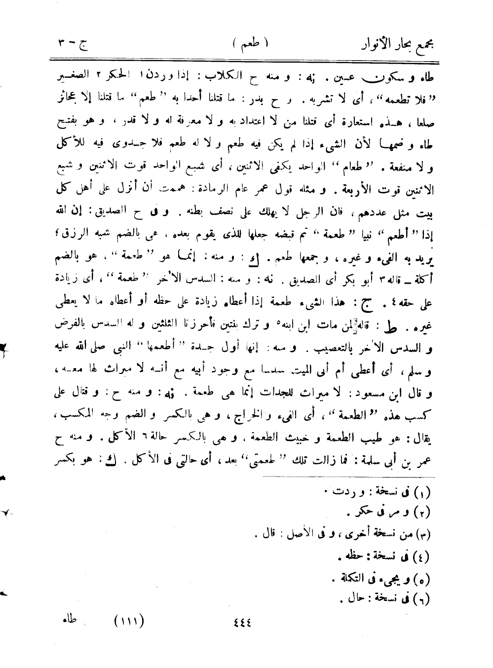 طاء وسكون عين. نه: ومنه ح الكلاب: إذا وردن الحكر الصغير "فلا تطعمه"، أي لا تشربه. وح بدر: ما قتلنا أحدًا به "طعم" ما قتلنا إلا عجائز صلعًا، هذه استعارة أي قتلنا من لا اعتداد به ولا معرفة له ولا قدر، وهو بفتح طاء وضمها لأن الشيء إذا لم يكن فيه طعم ولا له طعم فلا جدوى فيه للأكل ولا منفعة. "طعام" الواحد يكفي الاثنين، أي شبع الواحد قوت الاثنين وشبع الاثنين قوت الأربعة. ومثله قول عمر عام الرمادة: هممت أن أنزل على أهل كل بيت مثل عددهم، فإن الرجل لا يهلك على نصف بطنه. وفي ح الصديق: إن الله إذا "أطعم" نبيًا "طعمة" ثم قبضه جعلها للذي يقوم بعده، هي بالضم شبه الرزق؛ يريد به الفيء وغيره، وجمعها طعم. ك: ومنه: إنما هو "طعمة"، هو بالضم أكلة- قاله أبو بكر أي الصديق. نه: ومنه: السدس الآخر "طعمة"، أي زيادة على حقه. ج: هذا الشيء طعمة إذا أعطاه زيادة على حظه أو أعطاه ما لا يعطي غيره. ط: قاله لمن مات ابن ابنه وترك بنتين فأحرزتا الثلثين وله السدس بالفرض والسدس الآخر بالتعصيب. ومنه: إنها أول جدة "أطعمها" النبي صلى الله عليه وسلم، أي أعطى أم أبي الميت سدسًا مع وجود أبيه مع أنه لا ميراث لها معه، وقال ابن مسعود: لا ميراث للجدات إنما هي طعمة. نه: ومنه ح: وقتال على كسب هذه "الطعمة"، أي الفيء والخراج، وهي بالكسر والضم وجه المكسب، يقال: هو طيب الطعمة وخبيث الطعمة، وهي بالكسر حالة الأكل. ومنه ح عمر بن أبي سلمة: فما زالت تلك "طعمتي" بعد، أي حالتي في الأكل. ك: هو بكسر