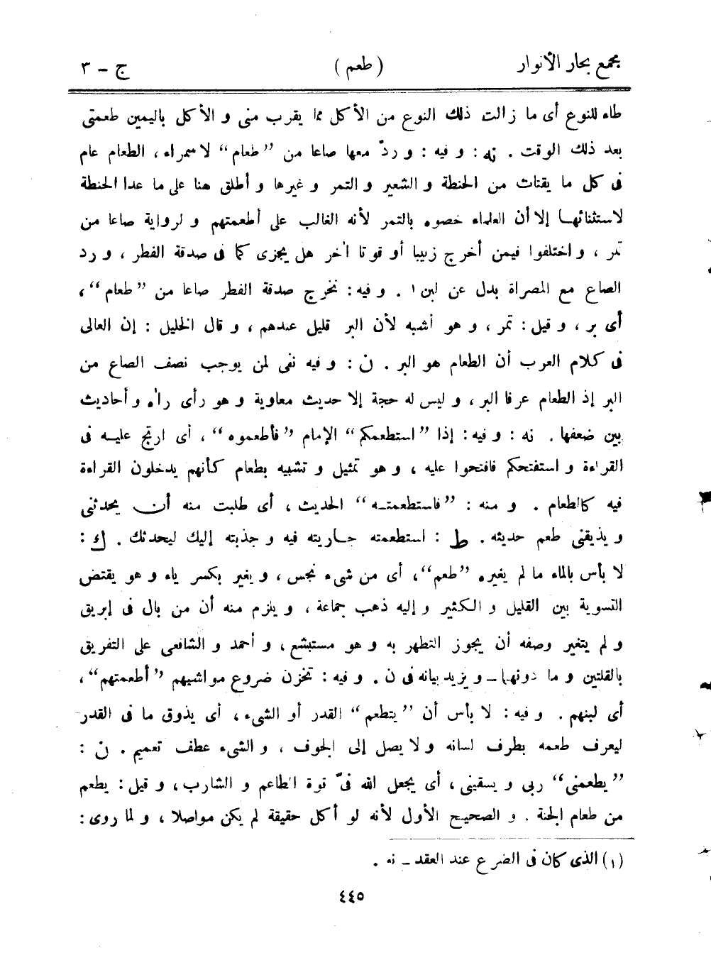 طاء للنوع أي ما زالت ذلك النوع من الأكل مما يقرب مني والأكل باليمين طعمتي بعد ذلك الوقت. نه: وفيه: ورد معها صاعًا من "طعام" لا سمراء، الطعام عام في كل ما يقتات من الحنطة والشعير والتمر وغيرها وأطلق هنا على ما عدا الحنطة لاستثنائها إلا أن العلماء خصوه بالتمر لأنه الغالب على أطعمتهم ولرواية صاعًا من تمر، واختلفوا فيمن أخرج زبيبًا أو قوتًا آخر هل يجزى كما في صدقة الفطر، ورد الصاع مع المصراة بدل عن لبن. وفيه: نخرج صدقة الفطر صاعًا من "طعام"، أي بر، وقيل: تمر، وهو أشبه لأن البر قليل عندهم، وقال الخليل: إن العالي في كلام العرب أن الطعام هو البر. ن: وفيه نفي لمن يوجب نصف الصاع من البر إذ الطعام عرفا البر، وليس له حجة إلا حديث معاوية وهو رأي رآه وأحاديث بين ضعفها. نه: وفيه: إذا "استطعمكم" الإمام "فأطعموه"، أي ارتج عليه في القراءة واستفتحكم فافتحوا عليه، وهو تمثيل وتشبيه بطعام كأنهم يدخلون القراءة فيه كالطعام. ومنه: "فاستطعمته" الحديث، أي طلبت منه أن يحدثني ويذيقني طعم حديثه. ط: استطعمته جاريته فيه وجذبته إليك ليحدثك. ك: لا بأس بالماء ما لم يغيره "طعم"، أي من شيء نجس، ويغير بكسر ياء وهو يقتض التسوية بين القليل والكثير وإليه ذهب جماعة، ويلزم منه أن من بال في إبريق ولم يتغير وصفه أن يجوز التطهر به وهو مستبشع، وأحمد والشافعي على التفريق بالقلتين وما دونهما- ويزيد بيانه في ن. وفيه: تخزن ضروع مواشيهم "أطعمتهم"، أي لبنهم. وفيه: لا بأس أن "يتطعم" القدر أو الشيء، أي يذوق ما في القدر ليعرف طعمه بطرف لسانه ولا يصل إلى الجوف، والشيء عطف تعميم. ن: "يطعمني" ربي ويسقيني، أي يجعل الله في قوة الطاعم والشارب، وقيل: يطعم من طعام الجنة. والصحيح الأول لأنه لو أكل حقيقة لم يكن مواصلًا، ولما روى: