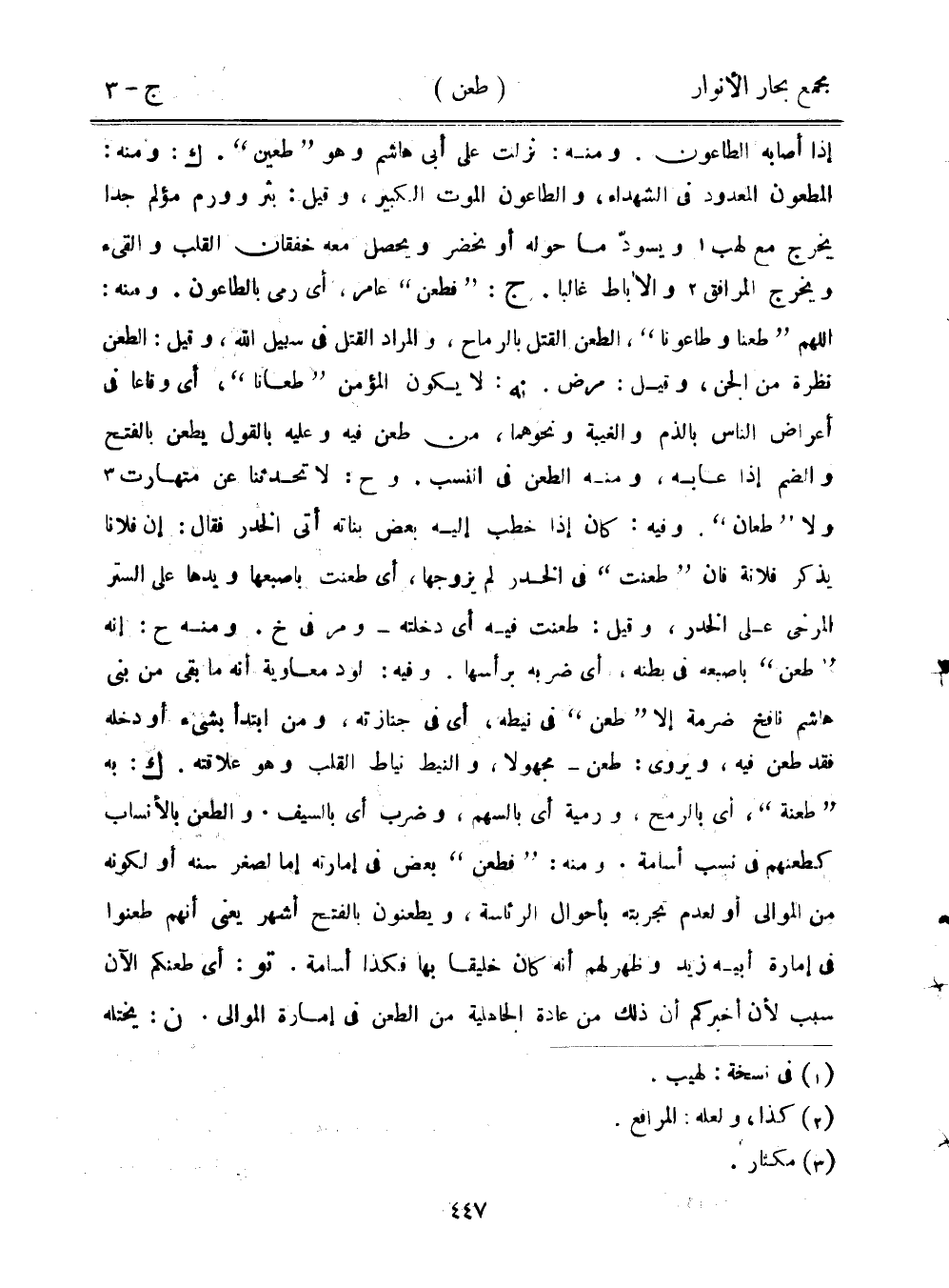 إذا أصابه الطاعون. ومنه: نزلت على أبي هاشم وهو "طعين". ك: ومنه: المطعون المعدود في الشهداء، والطاعون الموت الكبير، وقيل: بثر وورم مؤلم جدًا يخرج مع لهب ويسود ما حوله أو نحضر ويحصل معه خفقان القلب والقيء ويخرج المرافق والأباط غالبًا. ج: "فطعن" عامر، أي رمى بالطاعون. ومنه: اللهم "طعنا وطاعونا"، الطعن القتل بالرماح، والمراد القتل في سبيل الله، وقيل: الطعن نظرة من الجنس، وقيل: مرض. نه: لا يكون المؤمن "طعانًا"، أي وقاعًا في أعراض الناس بالذم والغيبة ونحوهما، من طعن فيه وعليه بالقول يطعن بالفتح والضم إذا عابه، ومنه الطعن في النسب. وح: لا تحدثنا عن متهارت ولا "طعان". وفيه: كان إذا خطب إليه بعض بناته أتى الخدر فقال: إن فلانا يذكر فلانة فإن "طعنت" في الخدر لم يزوجها، أي طعنت بإصبعها ويدها على الستر المرخي على الخدر، وقيل: طعنت فيه أي دخلته- ومر في خ. ومنه ح: إنه "طعن" بإصبعه في بطنه، أي ضربه برأسها. وفيه: لود معاوية أنه ما بقي من بني هاشم نافخ ضرمة إلا "طعن" في نيطه، أي في جنازته، ومن ابتدأ بشيء أو دخله فقد طعن فيه، ويروى: طعن- مجهولا، والنيط نياط القلب وهو علاقته. ك: به "طعنة"، أي بالرمح، ورمية أي بالسهم، وضرب أي بالسيف. والطعن بالأنساب كطعنهم في نسب أسامة. ومنه: "فطعن" بعض في إمارته إما لصغر سنه أو لكونه من الموالي أو لعدم تجربته بأحوال الرئاسة، ويطعنون بالفتح أشهر يعني أنهم طعنوا في إمارة أبيه زيد وظهر لهم أنه كان خليقًا بها فكذا أسامة. تو: أي طعنكم الآن سبب لأن أخبركم أن ذلك من عادة الجاهلية من الطعن في إمارة الموالي. ن: يختله