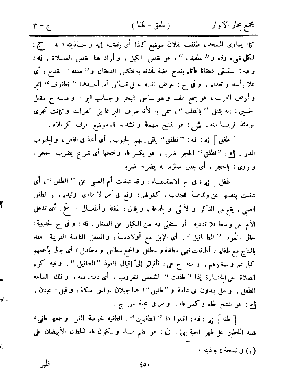 [طفل] نه: في ح الاستسقاء: وقد شغلت أم الصبي عن "الطفل"، أي شغلت بنفسها عن ولدها للجدب، كقولهم: وقع في أمر لا ينادي وليده، والطفل الصبي، يقع على الذكر والأنثى والجماعة، ويقال: طفلة وأطفال. غ: أي تذهل الأم عن ولدها فلا تناديه، أو استغنى فيه من الكبار عن الصغار. نه: وفي ح الحديبية: جاؤا بالعوذ "المطافيل"، أي الإبل مع أولادها، والطفل الناقة القريبة العهد بالنتاج مع طفلها، أطفلت فهي مطفلة ومطفل والجمع مطافل ومطافيل؛ أي جاؤا بأجمعهم كبارهم وصغارهم. ومنه ح على: فأقبلتم إلي إقبال العوذ "المطافيل". وفيه: كره الصلاة على الجنازة إذا "طفلت" الشمس للغروب، أي دنت منه، وتلك الساعة الطفل. وهل يبدون لي شامة و"طفيل"؛ هما جبلان بنواحي مكة، وقيل: عينان. ك: هو بفتح طاء وكسر فاء- ومر في مجنة من ج.