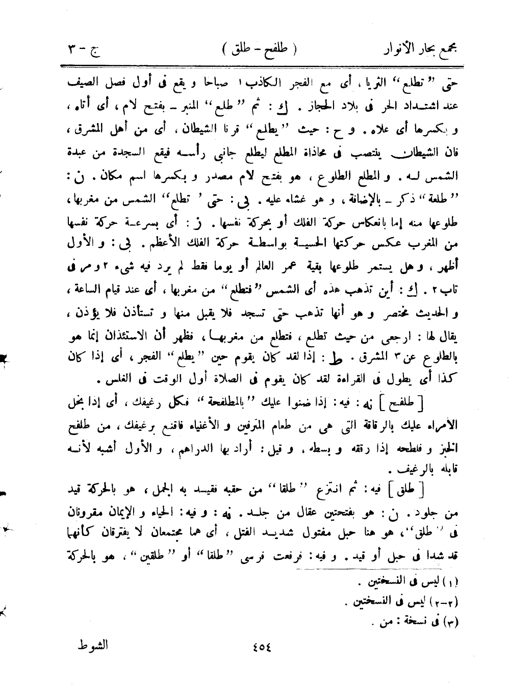 حتى "تطلع" الثريا، أي مع الفجر الكاذب صباحًا ويقع في أول فصل الصيف عند اشتداد الحر في بلاد الحجاز. ك: ثم "طلع" المنبر- بفتح لام، أي أتاه، وبكسرها أي علاه. وح: حيث "يطلع" قرنا الشيطان، أي من أهل المشرق، فإن الشيطان ينتصب في محاذاة المطلع ليطلع جانبي رأسه فيقع السجدة من عبدة الشمس له. والمطلع الطلوع، هو بفتح لام مصدر وبكسرها اسم مكان. ن: "طلعة" ذكر- بالإضافة، وهو غشاء عليه. بي: حتى "تطلع" الشمس من مغربها، طلوعها منه إما بانعكاس حركة الفلك أو بحركة نفسها. ز: أي بسرعة حركة نفسها من المغرب عكس حركتها الحسية بواسطة حركة الفلك الأعظم. بي: والأول أظهر، وهل يستمر طلوعها بقية عمر العالم أو يومًا فقط لم يرد فيه شيء ومر في تاب. ك: أين تذهب هذه أي الشمس "فتطلع" من مغربها، أي عند قيام الساعة، والحديث مختصر وهو أنها تذهب حتى تسجد فلا يقبل منها وتستأذن فلا يؤذن، يقال لها: ارجعي من حيث تطلع، فتطلع من مغربها، فظهر أن الاستئذان إنما هو بالطلوع عن المشرق. ط: إذا لقد كان يقوم حين "يطلع" الفجر، أي إذا كان كذا أي يطول في القراءة لقد كان يقوم في الصلاة أول الوقت في الغلس.