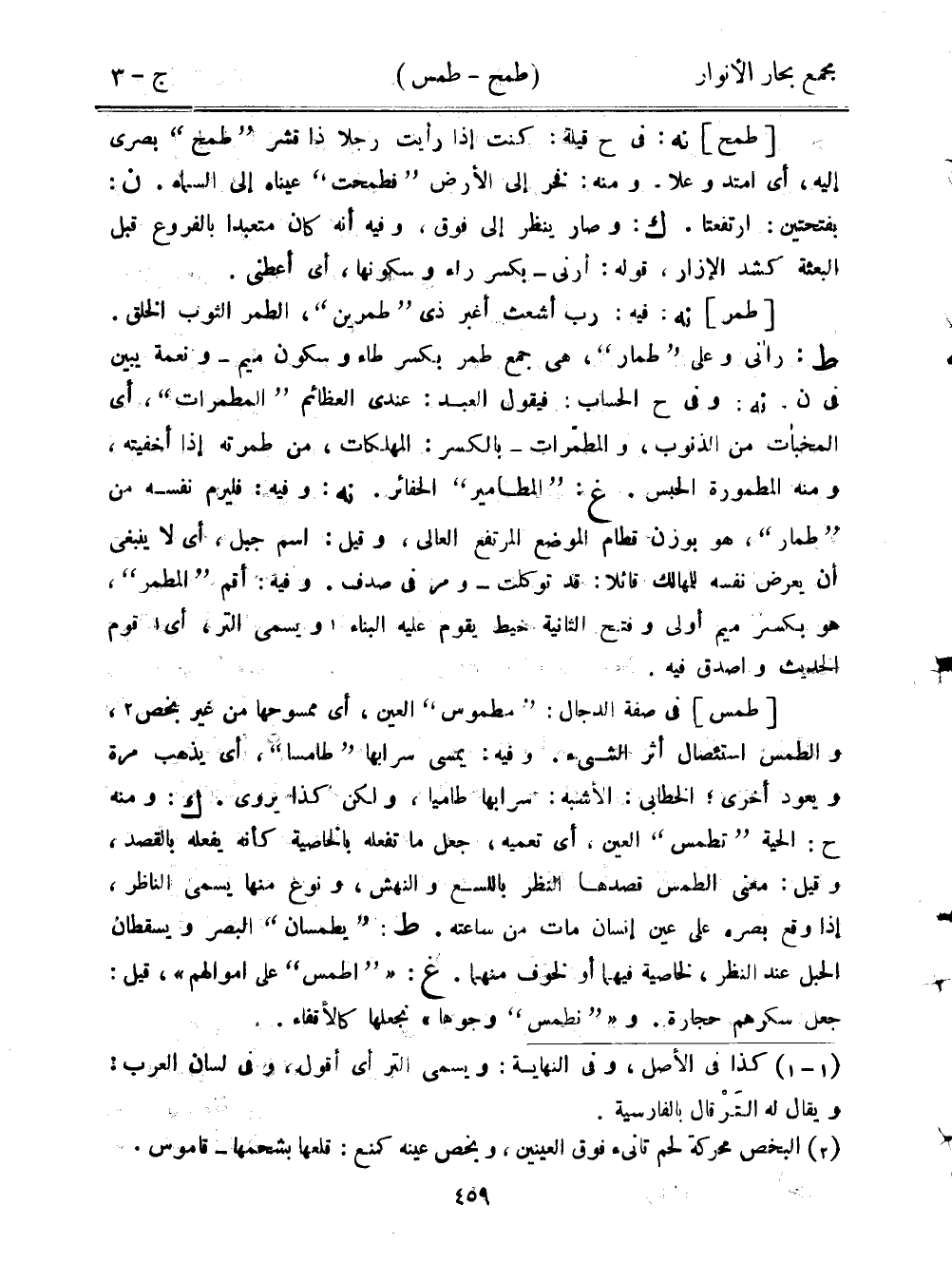 [طمس] في صفة الدجال: "مطموس" العين، أي ممسوحها من غير بخص، والطمس استئصال أثر الشيء. وفيه: يمسي سرابها "طامسًا"، أي يذهب مرة ويعود أخرى، الخطابيك الأشبه: سرابها طاميا، ولكن كذا يروى. ك: ومنه ح: الحية "تطمس" العين، أي تعميه، جعل ما تفعله بالخاصية كأنه يفعله بالقصد، وقيل: معنى الطمس قصدها النظر باللسع والنهش، ونوع منها يسمى الناظر، إذا وقع بصره على عين إنسان مات من ساعته. ط: "يطمسان" البصر ويسقطان الحبل عند النظر، لخاصية فيهما أو لخوف منهما. غ: ""اطمس" على أموالهم"، قيل: جعل سكرهم حجارة. و""نطمس" وجوهًا" نجعلها كالأقفاء.