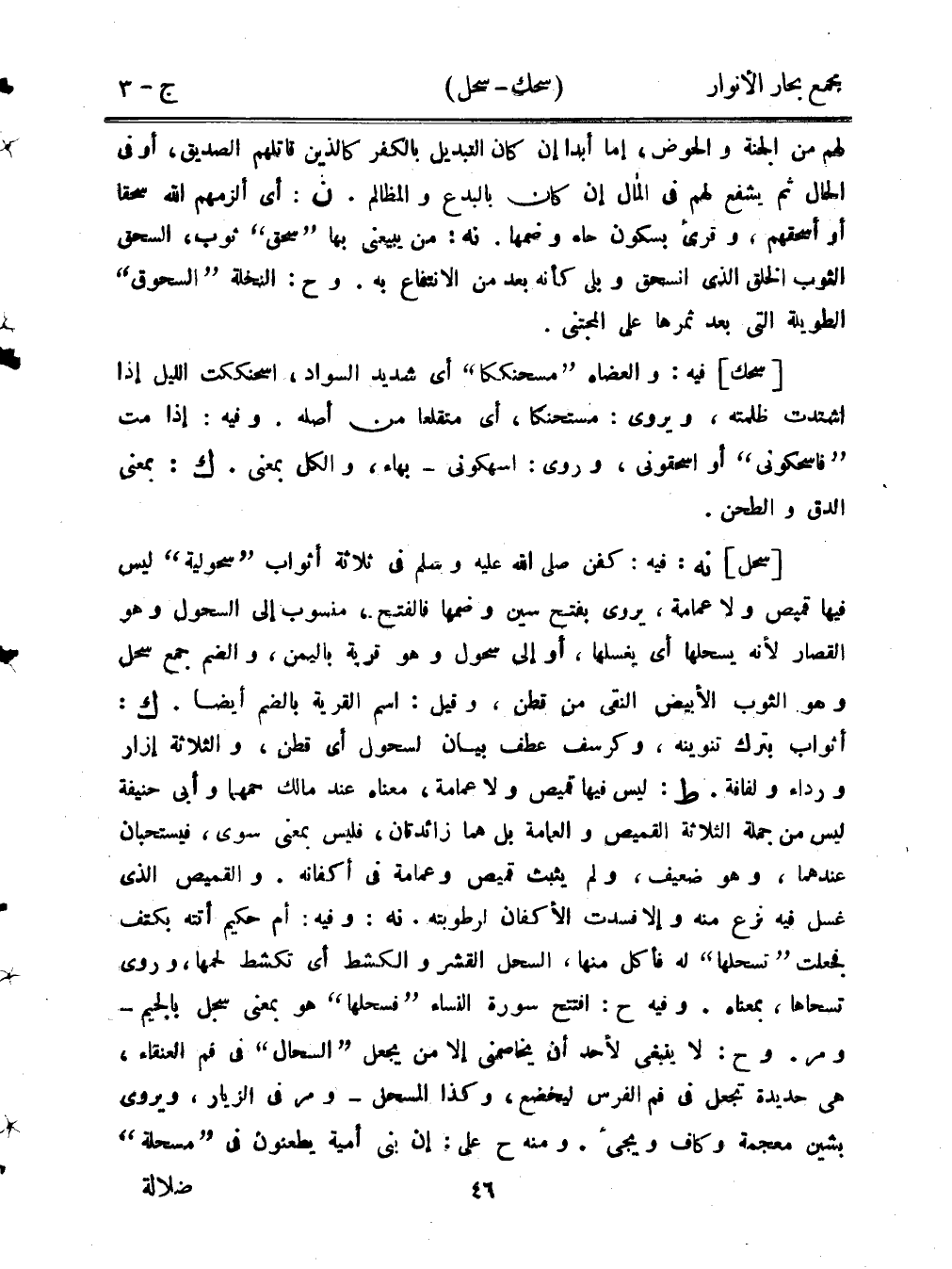 [سحل] نه: فيه: كفن صلى الله عليه وسلم في ثلاثة أثواب "سحولية" ليس فيها قميص ولا عمامة، يوى فتح سين وضمها فالفتح، منسوب إلى السحول وهو القصار لأنه يسحلها أي يغسلها، أو إلى سحول وهو قرية باليمن، والضمن جمع سحل وهو الثوب الأبيض النقي من قطن، وقيل: اسم القرية بالضم أيضًا. ك: أثواب بترك تنوينه، وكرسف عطف بيان لسحول أي قطن، والثلاثة إزار ورداء ولفافة. ط: ليس فيها قميص ولا عمامة، معناه عند مالك حمهما وأبي حنيفة ليس من جملة الثلاثة القميص والعمامة بل هما زائدتان، فليس بمعنى سوى، فيستحبان عندهما، وهو ضعيف، ولم يثبت قميص وعمامة في أكفانه. والقميص الذي غسل فيه نزع منه وإلا فسدت الأكفان لرطوبته. نه: وفيه: أم حكيم أتته بكتف فجعلت "تسحلها" له فأكل منها، السحل القشر والكشط أي تكشط لحمها، وروى تسحاها، بمعناه. وفيه ح: افتتح سورة النساء "فسحلها" هو بمعنى سجل بالجيم - ومر. وح: لا ينبغي لأحد أن يخاصمني إلا من يجعل "السحال" في فم العنقاء، هي حديدة تجعل في فم الفرس ليخضع، وكذا المسحل - ومر في الزيار، ويروى بشين معجمة وكاف ويجئ. ومنه ح على: إن بني أمية يطعنون في "مسحلة"