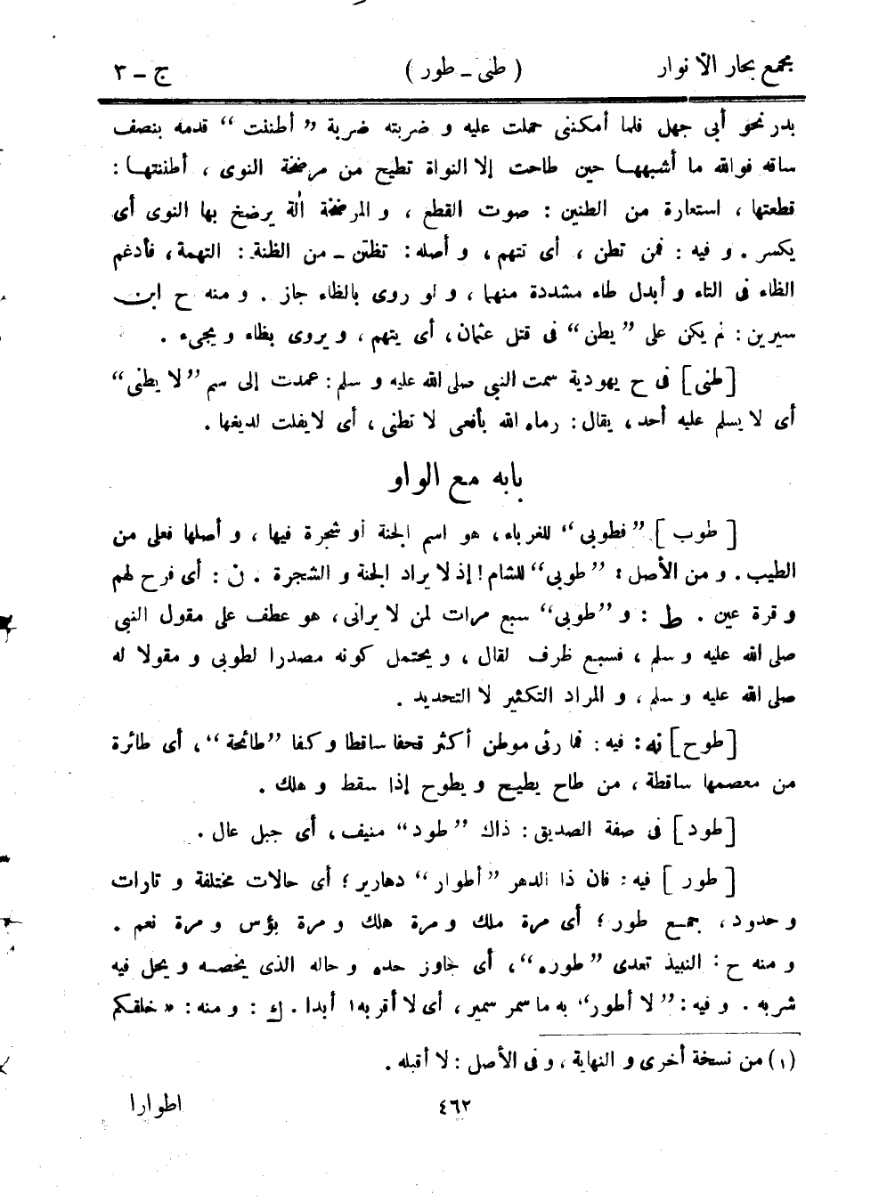 [طور] فيه: فإن ذا الدهر "أطوار" دهارير؛ أي حالات مختلفة وتارات وحدود، جمع طور؛ أي مرة ملك ومرة هلك ومرة بؤس ومرة نعم. ومنه ح: النبيذ تعدى "طوره"، أي جاوز حده وحاله الذي يخصه ويحل فيه شربه. وفيه: "لا أطور" به ما سمر سمير، أي لا أقربه أبدًا. ك: ومنه: "خلقكم
