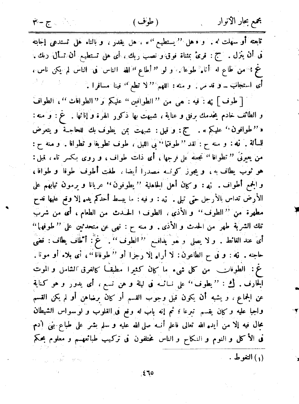 [طوف] نه: فيه: هي من "الطوافين" عليكم و"الطوافات"، الطواف والطائف خادم يخدمك برفق وعناية، شبهت بها ذكور الهرة وإناثها. غ: ومنه: ""طوافون" عليكم". ج: وقيل: شبهت بمن يطوف بك للحاجة ويتعرض للمسألة. نه: ومنه ح: لقد "طوفتما" بي الليل، طوف تطويفًا وتطوافًا. ومنه ح: من يعيرني "تطوافًا" تجعله على فرجها، أي ذات طواف، وروى بكسر تاء، قيل: هو ثوب يطاف به، ويجوز كونه مصدرًا أيضًا، طفت أطوف طوفًا وطوافًا، والجمع أطواف. نه: وكان أهل الجاهلية "يطوفون" عريانًا ويرمون ثيابهم على الأرض تداس بالأرجل حتى تبلى. نه: وفيه: ما يبسط أحدكم يده إلا وقع عليها قدح مطهرة من "الطوف" والأذى، الطوف الحدث من الطعام، أي من شرب تلك الشربة طهر من الحدث والأذى. ومنه ح: نهى عن متحدثين على "طوفهما" أي عند الغائط. ولا يصلي وهو يدافع "الطوف". غ: أطاف يطاف: قضى حاجته. نه: وفي ح الطاعون: لا أراه إلا رجزًا أو "طوفانًا"، أي بلاء أو موتًا. غ: الطوفان من كل شيء ما كان كثيرًا مطبقًا كالغرق الشامل والموت الجارف. ك: "يطوف" على نسائه في ليلة وهن تسع، أي يدور وهو كناية عن الجماع، ويشبه أن يكون قبل وجوب القسم أو كان برضاهن أو لم يكن القسم واجبًا عليه وكان يقسم تبرعًا؛ ثم إنه باب له وقع في القلوب ولوسواس الشيطان مجال فيه إلا من أيده الله تعالى فاعلم أنه صلى الله عليه وسلم بشر على طباع بني آدم في الأكل والنوم والنكاح والناس مختلفون في تركيب طبائعهم ومعلوم بحكم