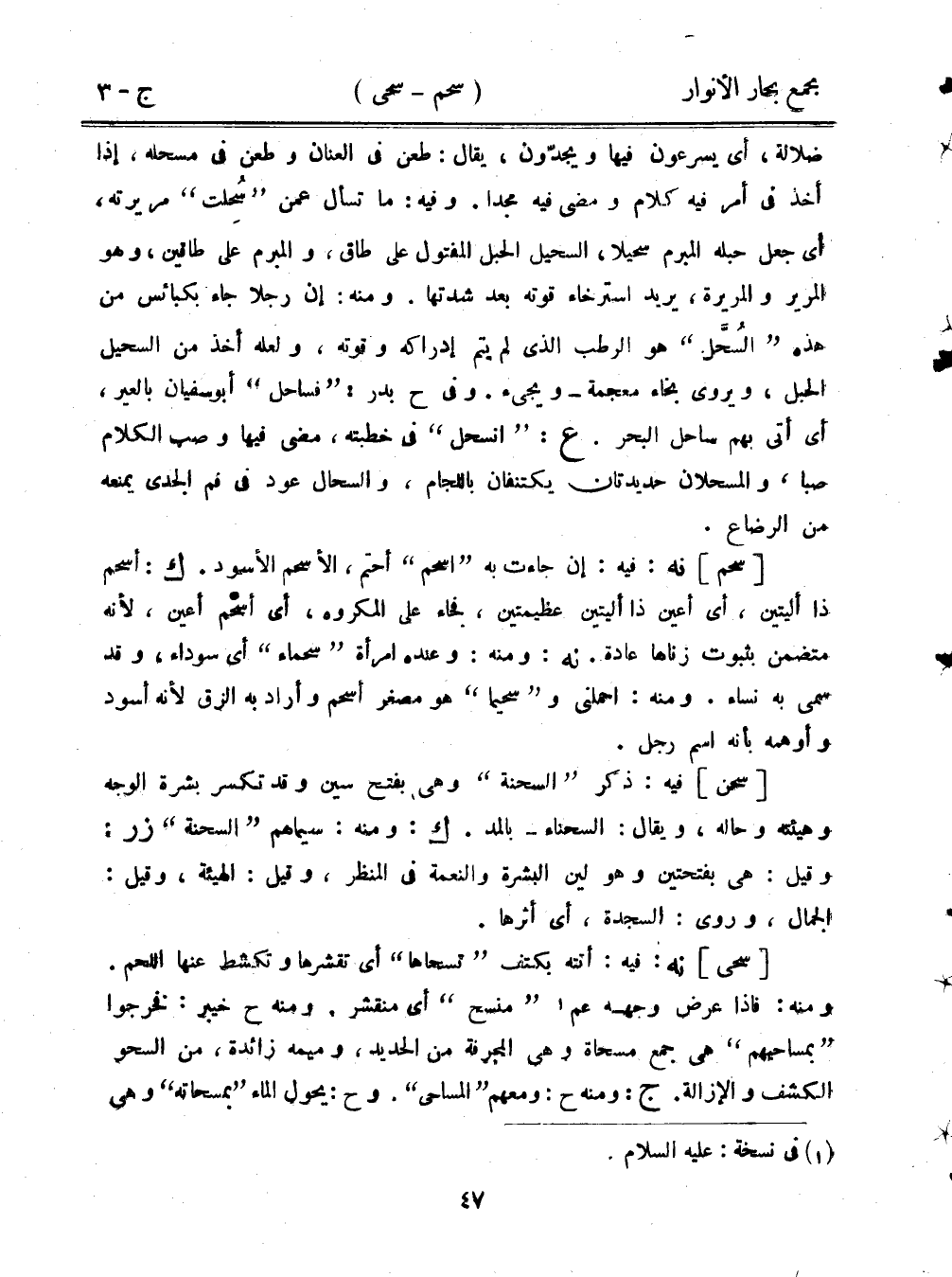 ضلالة، أي يسرعون فيها ويجدون، يقال: طعن في العنان وطعن في مسحله، إذا أخذ في أمر فيه كلام ومضى فيه مجدًا. وفيه: ما تسأل عمن "سحلت" مريرته، أي جعل حبله المبرم سحيلا، السحيل الحبل المفتول على طاق، والمبرم على طاقين، وهو المرير والمريرة، يريد استرخاء قوته بعد شدتها. ومنه: إن رجلًا جاء بكبائس من هذه "السحل" هو الرطب الذي لم يتم إدراكه وقوته، ولعله أخذ من السحيل الحبل، ويروى بخاء معجمة - ويجئ. وفي ح بدر: "فساحل" أبو سفيان بالعير، أي أتى بهم ساحل البحر. ع: "انسحل" في خطبته، معنى فيها وصب الكلام صبًا، والمسحلان حديدتان يكتنفان باللجام، والسحال عود في فم الجدي يمنعه من الرضاع.