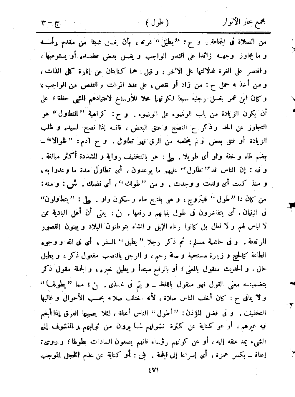 من الصلاة في الجماعة. وح: "يطيل" غرته، بأن يغسل شيئًا من مقدم رأسه وما يجاوز وجهه زائدًا على القدر الواجب ويغسل بعض عضده أو يستوعبها، واقتصر على الغرة لدلالتها على الآخر، وقيل: هما كنايتان عن إنارة كل الذات، ومن أخذ به حمل ح: من زاد أو نقص، على عدد المرات والنقص من الواجب، وكان ابن عمر يغسل رجليه سبعًا لكونهما محلًا للأوساخ لاعتيادهم المشي حفاة؛ على أن يكون الزيادة من باب الوضوء على الوضوء. وح: كراهية "التطاول" هو التجاوز عن الحد وذكر ح النصح وعتق البعض، فإنه إذا نصح لسيده وطلب الزيادة أو عتق بعض ولم يخلصه من الرق فهو تطاول. وح آدم: "طوالًا"- بضم طاء وخفة واو أي طويلًا. ط: هو بالتخفيف رواية والمشددة أكثر مبالغة. وفيه: إن الناس قد "تطاول" عليهم ما يوعدون، أي تطاول مدة ما وعدوا به، ومنذ كنت أي ولدت ووجدت. ومن "طولك"، أي فضلك. ش: ومنه: من كان ذا "طول" فليتزوج، وهو بفتح طاء وسكون واو. ط: "يتطاولون" في البنيان، أي يتفاخرون في طول بنيانهم ورفعها. ن: يعني أن أهل البادية ممن لا لباس لهم ولا نعال بل كانوا رعاء الإبل والشاء يتوطنون البلاد ويبنون القصور المرتفعة. وفي حاشية مسلم: ثم ذكر رجلًا "يطيل" السفر، أي في الله ووجوه الطاعة كالحج وزيارة مستحبة وصلة رحم، والرجل بالنصب مفعول ذكر، ويطيل حال، والحديث منقول بالمعنى؛ أو بالرفع مبتدأ ويطيل خبره، والجملة مقول ذكر بتضمينه معنى القول فهو منقول باللفظ- ويتم في غذى. ن: مما "يطولها" ولا ينافي ح: كان أخف الناس صلاة، لأنه اختلف صلاته بحسب الأحوال وغالبها التخفيف. وفي فضل المؤذن: "أطول" الناس أعناقًا، لئلا يصيبها العرق إذا ألجم فيه غيرهم، أو هو كناية عن كثرة تشوفهم لما يرون من ثوابهم والمتشوف إلى الشيء يمد عنقه إليه، أو عن كونهم رؤساء فإنهم يصفون السادات بطولها؛ وروى: إناقًا- بكسر همزة، أي إسراعًا إلى الجنة. بي: أو كناية عن عدم الخجل الموجب
