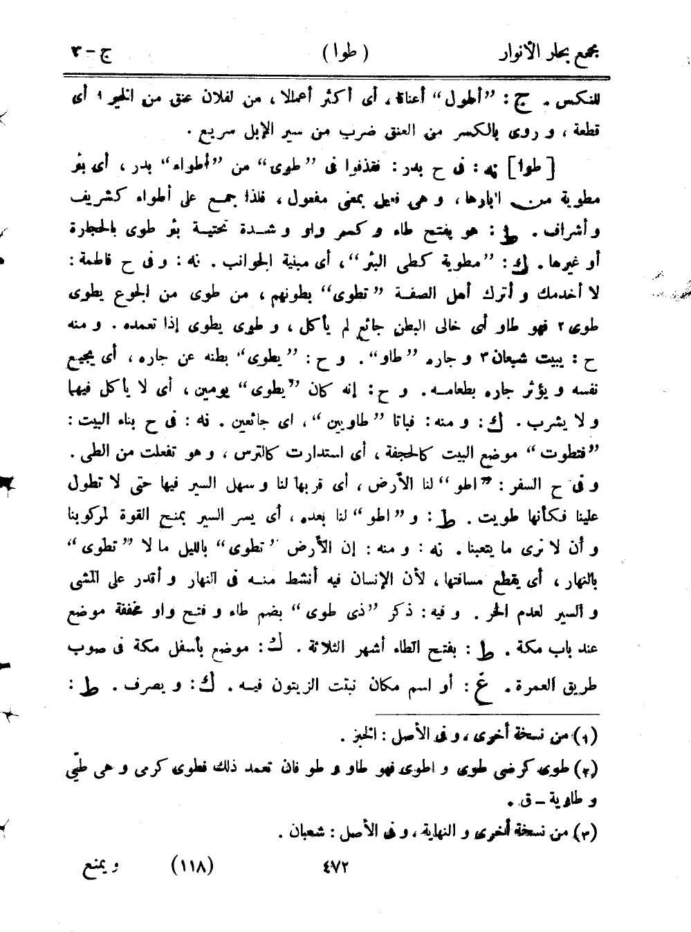 [طوا] نه: في ح بدر: فقذفوا في "طوى" من "أطواء" بدر، أي بئر مطوية من آبارها، وهي فعيل بمعنى مفعول، فلذا جمع على أطواء كشريف وأشراف. ط: هو بفتح طاء وكسر واو وشدة تحتية بئر طوى بالحجارة أو غيرها. ك: "مطوية كطي البئر"، أي مبنية الجوانب. نه: وفي ح فاطمة: لا أخدمك وأترك أهل الصفة "تطوى" بطونهم، من طوى من الجوع يطوى طوى فهو طاو أي خالي البطن جائع لم يأكل، وطوى يطوي إذا تعمده. ومنه ح: يبيت شبعان وجاره "طاو". وح: "يطوى" بطنه عن جاره، أي يجيع نفسه ويؤثر جاره بطعامه. وح: إنه كان "يطوى" يومين، أي لا يأكل فيهما ولا يشرب. ك: ومنه: فباتا "طاويين"، أي جائعين. نه: في ح بناء البيت: "فتطوت" موضع البيت كالحجفة، أي استدارت كالترس، وهو تفعلت من الطي. وفي ح السفر: "اطو" لنا الأرض، أي قربها لنا وسهل السير فيها حتى لا تطول علينا فكأنها طويت. ط: و"اطو" لنا بعده، أي يسر السير بمنح القوة لمركوبنا وأن لا نرى ما يتعبنا. نه: ومنه: إن الأرض "تطوى" بالليل ما لا "تطوى" بالنهار، أي يقطع مسافتها، لأن الإنسان فيه أنشط منه في النهار وأقدر على المشي والسير لعدم الحر. وفيه: ذكر "ذي طوى" بضم طاء وفتح واو مخففة موضع عند باب مكة. ط: بفتح الطاء أشهر الثلاثة. ك: موضع بأسفل مكة في صوب طريق العمرة. غ: أو اسم مكان نبتت الزيتون فيه. ك: ويصرف. ط: