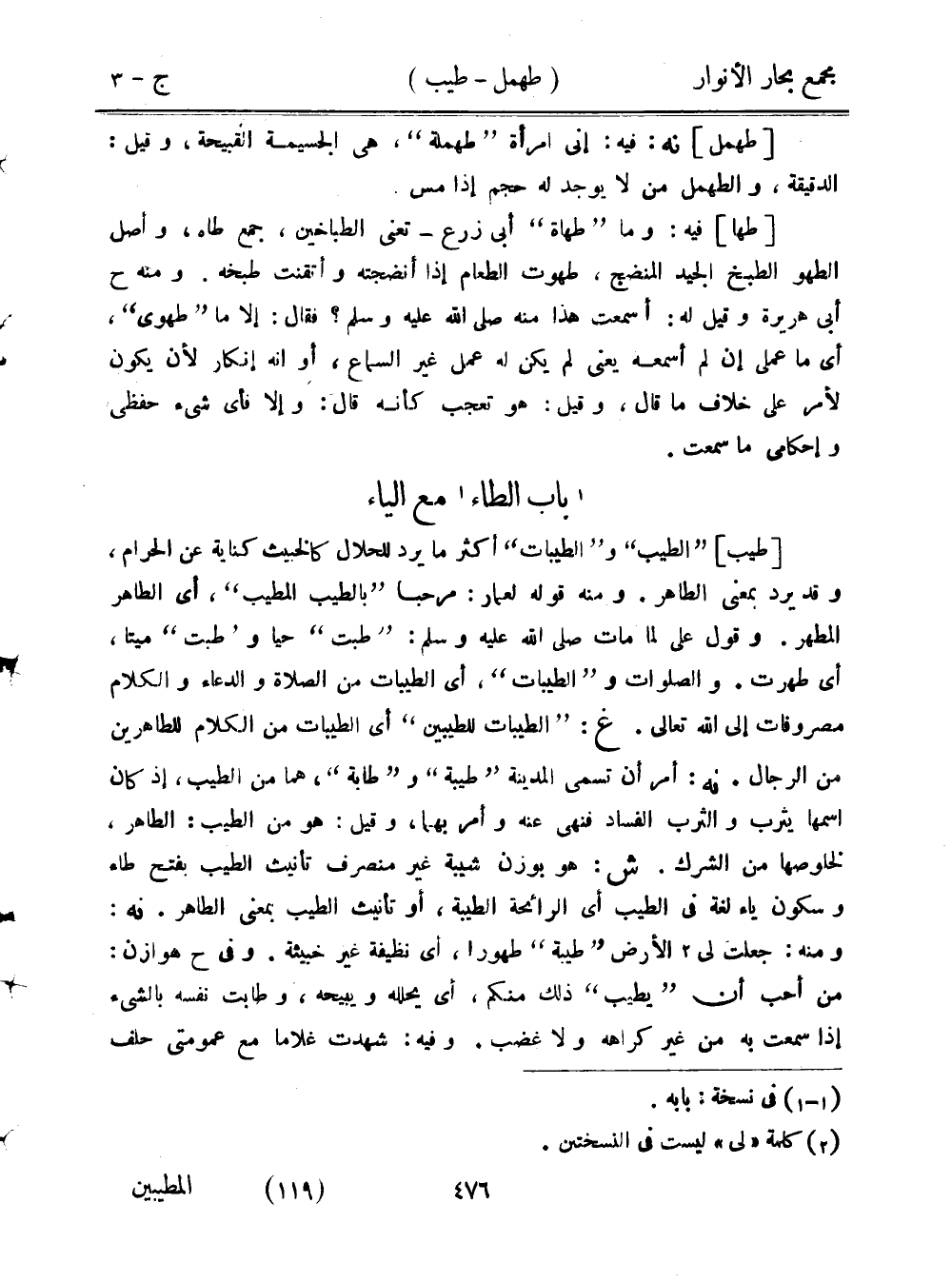 [طيب] "الطيب" و"الطيبات" أكثر ما يرد للحلال كالخبيث كناية عن الحرام، وقد يرد بمعنى الطاهر. ومنه قوله لعمار: مرحبا "بالطيب المطيب"، أي الطاهر المطهر. وقول على لما مات صلى الله عليه وسلم: "طبت" حيا و"طبت" ميتًا، أي طهرت. والصلوات و"الطيبات"، أي الطيبات من الصلاة والدعاء والكلام مصروفات إلى الله تعالى. غ: "الطيبات للطيبين" أي الطيبات من الكلام للطاهرين من الرجال. نه: أمر أن تسمى المدينة "طيبة" و"طابة"، هما من الطيب، إذ كان اسمها يثرب والثرب الفساد فنهى عنه وأمر بهما، وقيل: هو من الطيب: الطاهر، لخلوصها من الشرك. ش: هو بوزن شيبة غير منصرف تأنيث الطيب بفتح طاء وسكون ياء لغة في الطيب أي الرائحة الطيبة، أو تأنيث الطيب بمعنى الطاهر. نه: ومنه: جعلت لي الأرض "طيبة" طهورا، أي نظيفة غير خبيثة. وفي ح هوازن: من أحب أن "يطيب" ذلك منكم، أي يحلله ويبيحه، وطابت نفسه بالشيء إذا سمعت به من غير كراهة ولا غضب. وفيه: شهدت غلامًا مع عمومتي حلف