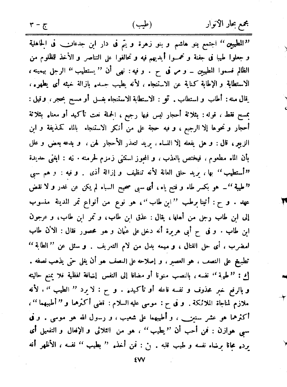 "المطيبين" اجتمع بنو هاشم وبنو زهرة ويتم في دار ابن جدعان في الجاهلية وجعلوا طيبًا في جفنة وغمسوا أيديهم فيه وتحالفوا على التناصر والأخذ للمظلوم من الظالم فسموا المطيبين- ومر في ح. وفيه: نهى أن "يستطيب" الرجل بيمينه، الاستطابة والإطابة كناية عن الاستنجاء، لأنه يطيب جسده بإزالة خبثه أي يطهره، يقال منه: أطاب واستطاب. تو: الاستطابة الاستنجاء بغسل أو مسح بحجر، وقيل: بمسح فقط، قوله: بثلاثة أحجار ليس فيها رجيع، الجملة نعت تأكيد أو معناه بثلاثة أحجار ونحوها إلا الرجيع، وفيه حجة على من أنكر الاستنجاء بالماء كحذيفة وابن الزبير، قال: وهل يفعله إلا النساء، يريد لتعذر الأحجار لهن، وبدعه بعض وعلل بأن الماء مطعوم، فيختص بالعذب، والمجوز استثنى زمزم لحرمته. نه: ابغني حديدة "أستطيب" بها، يريد حلق العانة لأنه تنظيف وإزالة أذى. وفيه: وهم سبي "طيبة"- هو بكسر طاء وفتح ياء، أي سبي صحيح السباء لم يكن عن غدر ولا نقض عهد. وح: أتينا برطب "ابن طاب"، هو نوع من أنواع تمر المدينة منسوب إلى ابن طاب رجل من أهلها، يقال: عذق ابن طاب، وتمر ابن طاب، وعرجون ابن طاب. وفي ح أبي هريرة أنه دخل على عثمان وهو محصور فقال: الآن طاب أمضرب، أي حل القتال، وميمه بدل من لام التعريف. وسئل عن "الطابة" تطبخ على النصف، هو العصير، وإصلاحه على النصف هو أن يغلي حتى يذهب نصفه. ك: "طيبة" نفسه، بالنصب منونًا أو مضافًا إلى النفس إضافة لفظية فلا يمنع حاليته وبالرفع خبر محذوف ونفسه فاعله أو تأكيده. وح: لا يرد "الطيب"، لأنه ملازم لمناجاة الملائكة. وفي ح: موسى عليه السلام: قضى أكثرهما و"أطيبهما"، أكثرهما هو عشر سنين، وأطيبهما على شعيب، ورسول الله هو موسى. وفي سبي هوازن: فمن أحب أن "يطيب"، هو من الثلاثي والإفعال والتفعيل أي يرده مجانًا برضاء نفسه وطيب قلبه. ن: فمن أخذه "بطيب" نفسه، الأظهر أنه